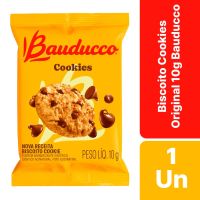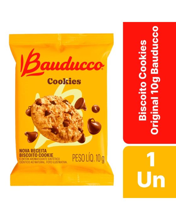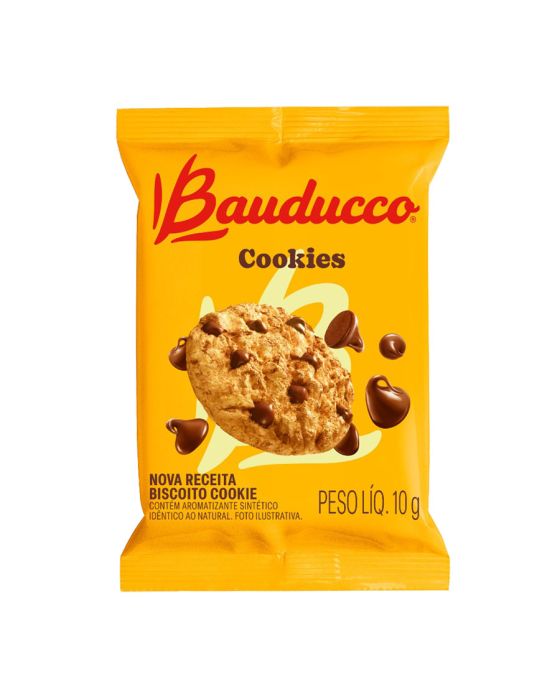 Características:- Cookies Bauducco Original: Sabor mais tradicional da categoria, com massa crocante e gotas de chocolate em cada unidade;- Embalagem individual de 10g: Praticidade para consumo unitário em eventos, café corporativo, coffee breaks, hotéis, recepções e brindes empresariais;- Excelência reconhecida: Marca Bauducco, referência nacional em snacks, ideal para empresas que valorizam qualidade e confiança nos produtos oferecidos a colaboradores e clientes;- Produto pronto para o consumo: Perfeito para reposição de máquinas de vending, cestas corporativas, kits de eventos, reuniões e confraternizações empresariais.Ingredientes: farinha de trigo enriquecida com ferro e ácido fólico, açúcar, gordura vegetal, gotas sabor chocolate (açúcar, gordura vegetal, cacau em pó, emulsificante: lecitina de soja, estabilizante: triestearato de sorbitana e aromatizante), gotas de chocolate, sal, fermentos químicos: bicarbonato de amônio, pirofosfato ácido de sódio e bicarbonato de sódio, aromatizantes e emulsificante: lecitina de soja. Informação nutricional e alergênicos:Contém glúten e lactose.Alérgicos: contém leite, derivados de trigo e de soja. Pode conter traços de outros grãos e oleaginosas.* As especificações podem ser alteradas sem aviso prévio ** Imagem meramente ilustrativa.