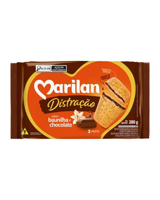 Características:- Biscoito recheado sabor baunilha com chocolate 300g: O Biscoito Distração Marilan é um produto alimentício composto por duas camadas de biscoito crocante, com base externa sabor baunilha e camada interna sabor chocolate. Sua formulação proporciona contraste equilibrado entre a leveza da baunilha e a intensidade do chocolate, garantindo textura crocante e sabor marcante.- Estrutura em camadas com combinação clássica e equilibrada: Apresenta camada externa de biscoito de baunilha e camada interna de biscoito sabor chocolate, oferecendo harmonização entre suavidade e sabor mais intenso. A embalagem de 300g contém 3 pacotes internos, permitindo melhor conservação, fracionamento e praticidade no consumo.- Consumo e prático para o dia a dia: Indicado para consumo imediato, é ideal para lanches, sobremesas rápidas, intervalos e acompanhamento de bebidas quentes ou frias.- Versátil para consumo doméstico e comercial: Recomendado para residências, lanchonetes, padarias, cantinas, mercearias e estabelecimentos comerciais que buscam oferecer opção de biscoito com combinação tradicional e ampla aceitação.- Sobre a marca Marilan: A Marilan é uma das maiores marcas de biscoitos do Brasil, reconhecida pela ampla variedade de produtos e pela consistência na entrega de qualidade, sabor e custo-benefício.- Ingredientes: Farinha de trigo enriquecida com ferro e ácido fólico, açúcar, gordura vegetal de palma, amido de milho*, açúcar invertido, cacau em pó, sal, corante caramelo IV, aromatizantes, fermentos químicos bicarbonato de sódio e bicarbonato de amônio, emulsificante lecitina de soja*, acidulante ácido láctico, melhoradores de farinha metabissulfito de sódio e melhoradores de farinha proteases Aspergillus oryzae Var. *Espécie doadora do gene: Agrobacterium tumefaciens, Bacillus thuringiensis, Zea mays.- Informação nutricional e alergênicos:Contém glúten.Alérgicos: Contém derivados de trigo e soja. Pode conter aveia, leite, centeio, cevada e amendoim.- Dimensões da embalagem:Comprimento: 24cm;Largura: 14,5cm;Altura: 3,5cm;Peso: 289g.* As especificações podem ser alteradas sem aviso prévio ** Imagem meramente ilustrativa.