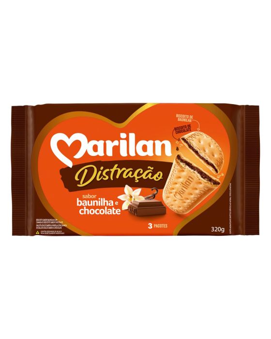 Caracteristicas:Biscoito Marilan Distração Baunilha e Chocolate 320gBiscoito por dentro e por fora, o Distração é a perfeita combinação de dois sabores em uma só mordida. - Embalagem: 320g- Marca: Marilan- Com 3 sub pacotes dentro da embalagem de venda- Baunilha por fora, com recheio de ChocolateIngredientes:Farinha de Trigo Fortificada com Ferro e Ácido Fólico, Açúcar, Gordura Vegetal, Creme de Milho, Açúcar Invertido, Sal, Cacau em pó, Fermentos Químicos Bicarbonato de Amônio (INS 503ii) e Bicarbonato de Sódio (INS 500ii), Estabilizante Lecitina de Soja (INS 322), Aromatizantes, Acidulante Ácido Láctico (INS 270), Melhoradores de Farinha Protease (INS 1101 i) e Metabissulfito de Sódio (INS 223).CONTÉM GLÚTEN.Contém traços de leite ou derivados, nozes, amendoim e coco.* As especificações podem ser alteradas sem aviso prévio ** Imagem meramente ilustrativa.