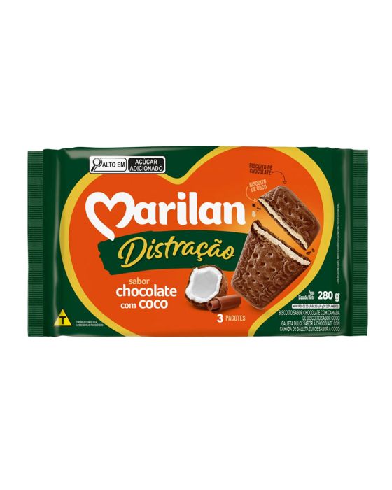 Características:- Biscoito recheado sabor chocolate com coco 280g: O Biscoito Distração Marilan é um produto alimentício composto por duas camadas de biscoito crocante, combinando base externa sabor chocolate com camada interna sabor coco. A formulação proporciona contraste de sabores e textura equilibrada, garantindo crocância e leveza em cada porção.- Combinação clássica de chocolate e coco: Apresenta camada externa de biscoito de chocolate e camada interna de biscoito sabor coco, oferecendo harmonização entre o sabor marcante do chocolate e o toque suave e levemente adocicado do coco. A embalagem de 280g contém 3 pacotes internos, facilitando o fracionamento, conservação e consumo individual.- Consumo e prático para o dia a dia: Indicado para consumo imediato, é ideal para lanches, intervalos, sobremesas rápidas e acompanhamento de bebidas quentes ou frias.- Versátil para consumo doméstico e comercial: Recomendado para residências, lanchonetes, padarias, mercearias, cantinas e estabelecimentos comerciais que desejam oferecer opção de biscoito com combinação tradicional e alta aceitação.- Sobre a marca Marilan: A Marilan é uma das maiores marcas de biscoitos do Brasil, reconhecida pela ampla variedade de produtos e pela consistência na entrega de qualidade, sabor e custo-benefício.- Ingredientes: Farinha de trigo enriquecida com ferro e ácido fólico, açúcar, gordura vegetal de palma, amido de milho*, açúcar invertido, cacau em pó, sal, corante caramelo IV, aromatizantes, fermentos químicos bicarbonato de amônio e bicarbonato de sódio, emulsificante lecitina de soja*, acidulante ácido láctico, melhoradores de farinha metabissulfito de sódio e proteases Aspergillus oryzae Var. *Espécie doadora do gene: Agrobacterium tumefaciens, Bacillus thuringiensis, Zea mays.- Informação nutricional e alergênicos:Contém glúten.Alérgicos: Contém derivados de trigo e soja. Pode conter aveia, leite, centeio, cevada e amendoim.- Dimensões da embalagem:Comprimento: 24cm;Largura: 14,5cm;Altura: 3,5cm;Peso: 289g.* As especificações podem ser alteradas sem aviso prévio ** Imagem meramente ilustrativa.
