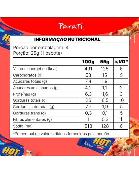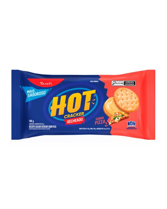 - Biscoito salgado recheado com formulação moderna e sabor aprimorado: O Biscoito Hot Cracker Pizza Parati foi desenvolvido para oferecer uma experiência de lanche prática, saborosa e diferenciada. Com um perfil salgado e recheado, característica pioneira no mercado brasileiro, combina textura crocante e recheio cremoso em uma formulação otimizada para maior intensidade de sabor e satisfação no consumo diário.