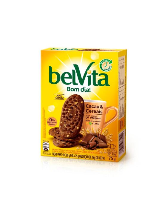 Caracteristicas:Para uma alimentação mais saudável, precisamos incluir o consumo de alimentos ricos em fibras, vitaminas e sais minerais em nossa dieta diária. Assim nasceu o Biscoito Belvita! O Biscoito Belvita sabor Cacau e cereais é produzido com ingredientes selecionados e possui em sua receita cereais integrais, ricos em vitaminas e sais minerais.Belvita Cacau e cereais é a união perfeita do sabor da avelã e a textura dos cereais.- Peso: 75g- Sabor: Cacau e CereaisIngredientes: Cereais 64% [farinha de trigo enriquecida com ferro, ácido fólico e vitaminas B3, B2 e B1, cereais integrais 37% (farinha de trigo integral, aveia em flocos, farinha de cevada e farinha de centeio)], açúcar, óleo vegetal, açúcar invertido, cacau em pó, gotas de cacau, carbonato de cálcio, leite em pó desnatado, sal, vitaminas: vitamina D e vitamina E, aromatizantes, fermentos químicos: bicarbonato de amônio, bicarbonato de sódio e fosfato monocálcico, corante caramelo l e emulsificantes: lecitina de soja e ésteres de ácido diacetil tartárico e mono e diglicerídeos.ALÉRGICOS: Contém derivados de trigo, soja e leite. pode conter cevada, castanha-do-pará, castanha-do-caju, avelã, macadâmia, aveia, amendoim, centeio e nozes. Contém Lactose. Contém Glúten. * As especificações podem ser alteradas sem aviso prévio ** Imagem meramente ilustrativa.