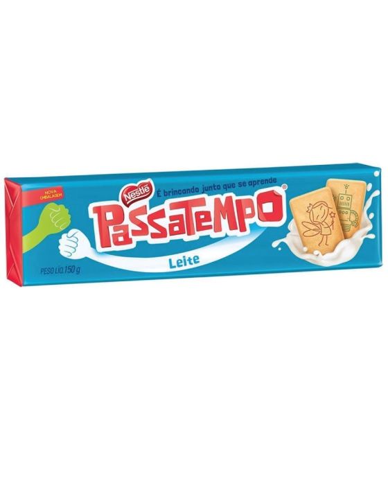 Caracteristicas:Biscoito Passatempo sem recheio. - Biscoito Passatempo - Embalagem: 150g - Marca: Nestlé - Sabor: Leite - Biscoito não recheado - Conservar em local seco, fresco e inodoro. - Após abrir a embalagem coloque os biscoitos em um recipiente seco e bem tampado.Ingredientes:Farinha de trigo enriquecida com ferro e ácido fólico, açúcar, óleo vegetal, leite em pó integral, carbonato de cálcio, amido, sal, sulfato de zinco, açúcar invertido, fermentos químicos bicarbonato de amônio, pirofosfato dissódico e bicarbonato de sódio, aromatizantes, emulsificantes lecitina de soja, ésteres de mono e diglicerídeos de ácidos graxos com ácido diacetil tartárico e mono e diglicerídeosde ácidos graxos, corante caramelo III e corantes naturais carmim e clorofila e umectante propileno glicol. CONTÉM GLÚTEN.* As especificações podem ser alteradas sem aviso prévio ** Imagem meramente ilustrativa.