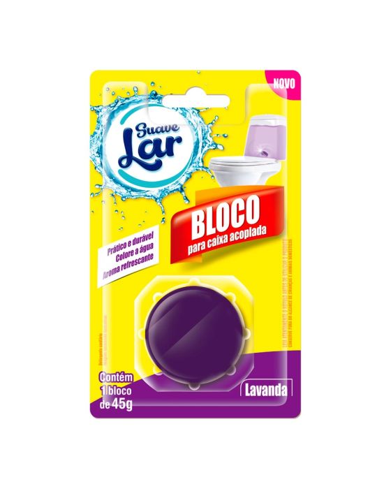 Caracteristicas:Os detergentes sanitários Suave Lar são elaborados para proporcionar o máximo desempenho no vaso sanitário deixando sempre as superfícies limpas e o ambiente com um agradável perfume.- Prático e durável- Colore a água- Aroma refrescante- Contém 1 bloco de 45gMod1o de uso1. Retire o bloco da embalagem.2. Levante levemente um dos lados da tampa do reservatório com cuidado e solte o bloco de modo que ele se posicione no fundo da caixa acoplada distante da saída da água.3. Aguarde 10 minutos para acionar a descarga.Obs.: Quando a coloração da água desaparecer, basta adicionar outro bloco dentro do reservatório. * As especificações podem ser alteradas sem aviso prévio ** Imagem meramente ilustrativa