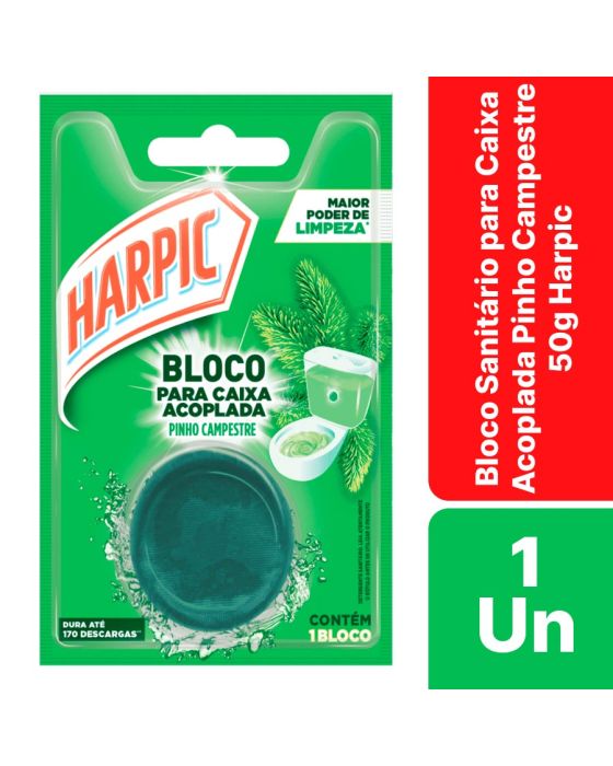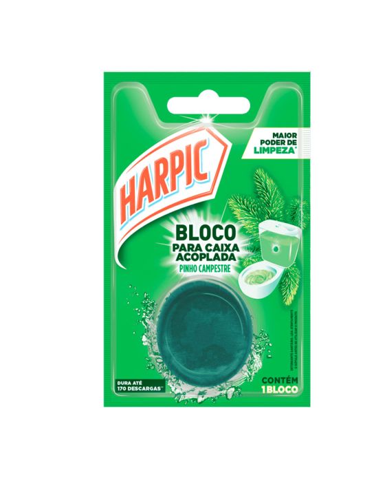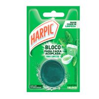 Características:Harpic para Caixa Acoplada é indicado para a limpeza completa do seu vaso começando pela caixa acoplada. Os agentes de espuma e limpeza liberam uma agradável fragrância, mantem a agua do seu vaso colorida e ainda dura até 170 descargas. Detalhes:- Marca: Harpic;- Modelo: Bloco para caixa acoplada;- Linha: Blocos sanitários;- Fragrância: Pinho Campestre;- Cor: Verde;- Contém: 1 embalagem com uma unidade do produto;- Embalagem promocional;- Dura até 170 descargas;- Maior poder de limpeza;- Recomendado por Celite;- Prático e fácil de usar;- Colore a água;- Não gera resíduos após o uso;- Limpa e perfuma desde a caixa acoplada.Indústria Brasileira. | Validade: 24 meses após a data de fabricação.Modo de uso:- Abra a embalagem plástica. Não remova o tecido que envolve o tablete. O tecido se dissolverá em contato com a água do vaso sanitário- Remova a tampa da caixa acoplada;- Jogue o tablete dentro da caixa acoplada longe da saída de água de vaso sanitário;- Recoloque a tampa e aguarde 10 minutos para acionar a descarga acoplada;- Quando a coloração da água diminuir, coloque outro tablete do Harpic Tablete para caixa acoplada.Precauções:- Evite o contato prolongado com a pele;- Depois de utilizar este produto, lave e seque as mãos;- Manter em sua embalagem original.Composição:- Dodecilbenzeno Sulfonato de Sódio, Coadjuvantes, Carga, Fragrâncias e Corante.Medidas: - Dimensões do produto: 13,4 x 9,4 x 2cm (CxLxA);- Dimensões do produto: 4,5 x 4,5 x 2cm(CxLxA);- Peso: 75g.ATENÇÃO! MANTENHA FORA DO ALCANCE DAS CRIANÇAS E DOS ANIMAIS DOMÉSTICOS.* As especificações podem ser alteradas sem aviso prévio ** Imagem meramente ilustrativa.