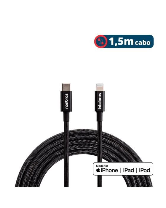 Características:- Cabo USB-C para Lightning 1,5m com carregamento rápido e alta durabilidade: O Cabo USB-C para Lightning EUCL15NP da Intelbras foi desenvolvido para garantir carregamento eficiente e sincronização de dados em dispositivos Apple. Com suporte à tecnologia Power Delivery, permite recarga rápida e segura, mantendo estabilidade mesmo após atualizações de sistema, graças ao conector homologado MFi.- Carregamento rápido e transmissão de dados com alto desempenho: Compatível com carregadores USB-C com Power Delivery de 18W ou superior, possibilita carregamento de até 50% da bateria em aproximadamente 30 minutos (para dispositivos compatíveis). Além disso, oferece velocidade de transferência de dados de até 480 Mbps, conforme padrão USB 2.0, garantindo eficiência no envio e recebimento de arquivos.- Construção reforçada com revestimento em nylon trançado: O cabo possui revestimento em nylon trançado de alta resistência, proporcionando maior durabilidade contra dobras, torções e desgastes do uso diário. Sua estrutura interna é projetada para suportar corrente de até 3.0A, mantendo desempenho consistente em aplicações contínuas.- Compatibilidade ampla com dispositivos Apple: Indicado para iPhones (8 ou superior), iPads e iPods com entrada Lightning, permitindo tanto carregamento quanto sincronização de dados. Ideal para uso residencial, corporativo e mobilidade, oferecendo maior liberdade com comprimento de 1,5 metros.- Sobre a marca Intelbras: A Intelbras é referência nacional em soluções tecnológicas, reconhecida pela confiabilidade, inovação e rigor técnico em seus produtos.- Itens inclusos na embalagem: 1 Cabo USB-C para Lightning Preto Intelbras.- Garantia do fornecedor: 3 anos contra defeitos de fabricação.- Dimensões da embalagem:Comprimento: 16,4cm;Largura: 8,2cm;Altura: 3cm;Peso: 74g.* As especificações podem ser alteradas sem aviso prévio ** Imagem meramente ilustrativa.