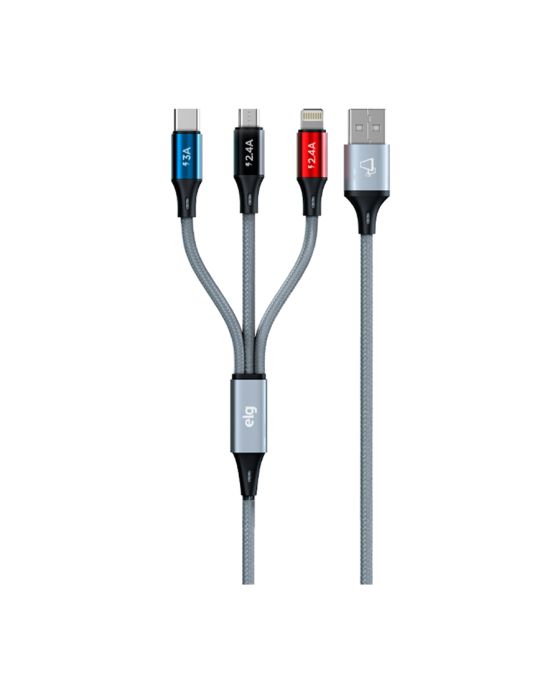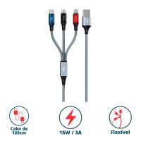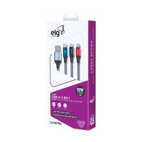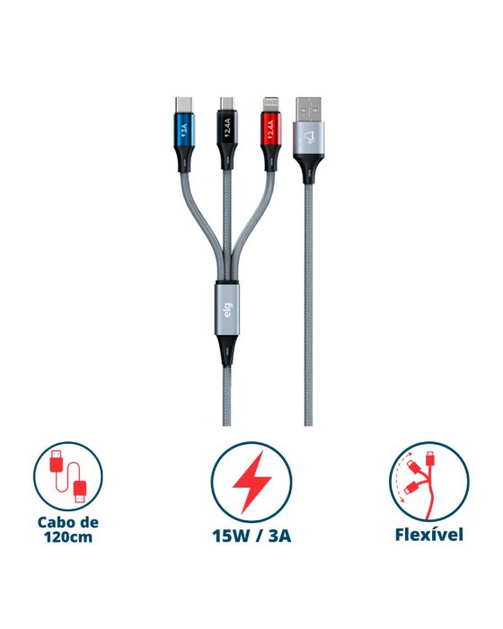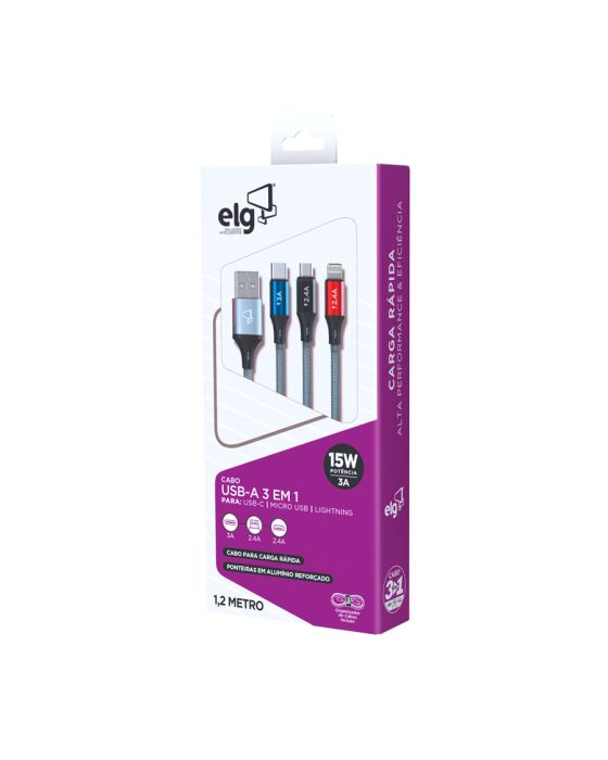 Características:- Versatilidade e eficiência em um único cabo: O Cabo para Smartphone 3 em 1 Turbo 1,2m Cinza CS-31CZ ELG foi desenvolvido para oferecer praticidade e desempenho no carregamento diário de diferentes dispositivos. Compatível com conexões Apple Lightning, Micro USB e USB Tipo-C, ele permite carregar até três aparelhos simultaneamente, tornando-se a solução ideal para quem utiliza múltiplos equipamentos no dia a dia, como smartphones, tablets, iPods, iPads e notebooks.- Construção reforçada e design sofisticado: Projetado para unir resistência, flexibilidade e estilo, o CS-31CZ possui revestimento em tecido trançado de alta resistência, que garante maior durabilidade contra dobras e desgaste natural do uso. As ponteiras em alumínio anodizado oferecem proteção extra e acabamento premium, além de cores modernas que conferem um visual diferenciado ao acessório. O cabo ainda acompanha um prático organizador em velcro, que facilita o transporte e mantém o espaço livre de emaranhados.- Alto desempenho no carregamento: O cabo entrega suporte de até 12W/2.4A para dispositivos Lightning e Micro USB, e até 15W/3A para equipamentos com entrada USB Tipo-C, garantindo carregamento turbo rápido e eficiente. Seus filamentos internos 100% de cobre asseguram melhor condução elétrica, resultando em maior velocidade e estabilidade durante a recarga.- Compatibilidade universal: Graças ao seu sistema 3 em 1, o CS-31CZ é compatível com a maioria dos dispositivos móveis do mercado. Seja para usuários Apple, Android ou aparelhos com entrada USB-C, o cabo se adapta com facilidade, eliminando a necessidade de múltiplos cabos diferentes.- Marca de confiança: A ELG é reconhecida no mercado por oferecer soluções inovadoras em acessórios eletrônicos, com foco em tecnologia, funcionalidade e durabilidade.- Itens inclusos na embalagem: 1 Cabo 3 em 1 Cinza ELG.- Garantia do fornecedor: Garantia limitada de 1 ano contra defeitos de fabricação. - Dimensões da embalagem:Comprimento: 8cm;Largura: 2,9cm;Altura: 17,8cm;Peso: 59g.* As especificações podem ser alteradas sem aviso prévio ** Imagem meramente ilustrativa.