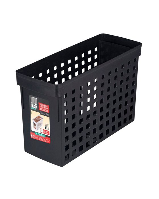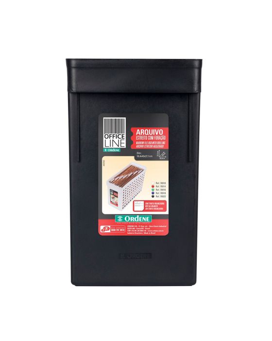 Caracteristicas:O jeito mais prático para organizar pastas suspensas é com o Arquivo Estreito com Furação da Ordene. Ideal para manter seus arquivos sempre ao seu alcance de forma organizada. Vem com etiqueta organizadora para fácil identificação.Detalhes:- Marca: Oredene.- Modelo: 70022.- Linha: Caixa Arquivo.- Cor: Preta.- Formato: Retangular.- Contém: 1 unidade do produto.- Medidas: 16,4 x 43 x 27,1 cm. (CxLxA).- Capacidade: Aproximadamente 10 a 12 pastas suspensas.- Material: Feito em plástico resistente.- Lávavel.* ATENÇÃO! Pastas suspensas não acompanham o produto e precisam ser adquiridas separadamente. ** As especificações podem ser alteradas sem aviso prévio *** Imagem meramente ilustrativa.