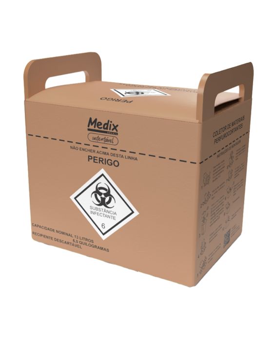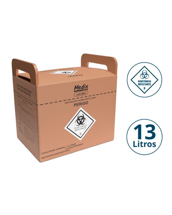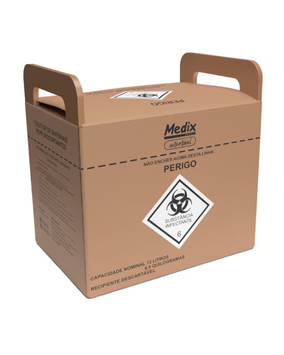 Características:A Caixa Coletor Perfuro-Cortante Sutentável 13L Medix é ideal para coleta de resíduos hospitalares, materiais infectantes, perfurantes e cortantes e pode ser aplicado em diversas áreas da saúde, como hospitais, clínicas médicas e odontológicas, laboratórios, postos de aplicações de vacinas e demais locais que precisem deste tipo de coleta dos resíduos, prevenindo acidentes e contaminações.Detalhes:- Marca: Medix;- Referência: 5673;- Linha: Coletores hospitalares;- Tipo: Perfurocortantes;- Cor: Marrom;- Capacidade: 13 Litros;- Tamanho: 28,5 x 20,5 x 24cm (CxLxA);- Contem: 1 unidade do produto com 4 acessórios;- Acompanha: Bandeja interna, fundo, cinta interna e sacola amarela;- Espaço para identificação: Setor, Local, Data de validade e Assinatura;- Recipiente descartável;- Não estéril;- Produto de uso único.Indústria Brasileira. | Validade: 5 anos após a data de fabricação impressa no produto.Ideal para:- Hospitais, Clínicas Médicas e Odontológicas e Laboratórios e demais locais que precisam de coleta de materiais perfurocortantes.Montagem da caixa:- Manual em vídeo para montagem: https://www.youtube.com/watch?v=V5O4Cy3pan4.Modo de uso:- Preencher somente até a linha pontilhada;- Não manuseie, reencape ou entorte as agulhas usadas;- Não desconecte a agulha da seringa, descarte o conjunto completo;- Após a utilização, fechar travando o lacre para fechamento;- Durante o transporte mantenha o coletor afastado do corpo.Orientações:- Descartável e de uso único;- Proibido reprocessar;- Armazenar e conservar em local seco e arejado protegendo do calor, umidade e da luz.Composição:- Coletor e Bandeja interna fabricado em papelão ondulado; - Sacola de revestimento fabricado em polietileno; - Fundo e Cinta interna fabricado em papelão rígido.Medidas: - Dimensões do produto montado: 28,5 x 20,5 x 24cm (CxLxA);- Dimensões do produto desmontado: 58 x 47,6 x 0,5cm (CxLxA);- Peso: 405g.Autorização Anvisa: AFE 804955-1.ATENÇÃO: PRODUTO ENVIADO DESMONTADO. PROIBIDO REPROCESSAR, DESTRUIR APÓS O USO!* As especificações podem ser alteradas sem aviso prévio ** Imagem meramente ilustrativa.