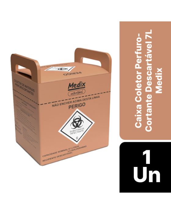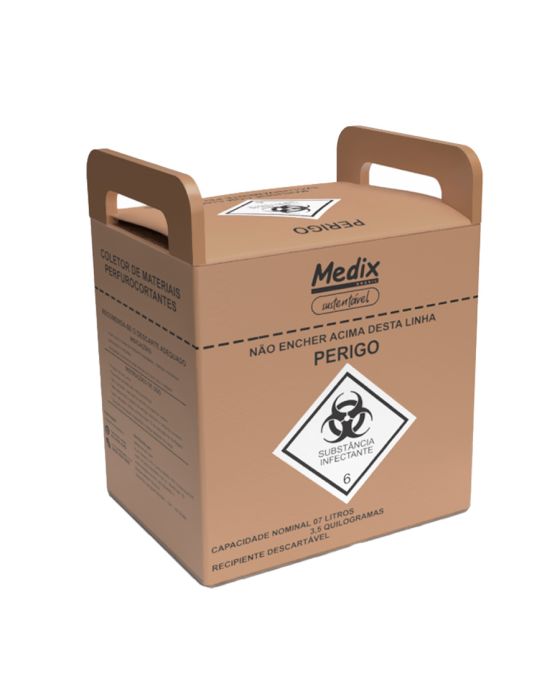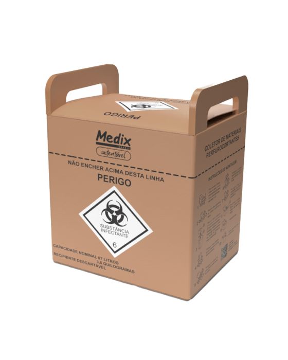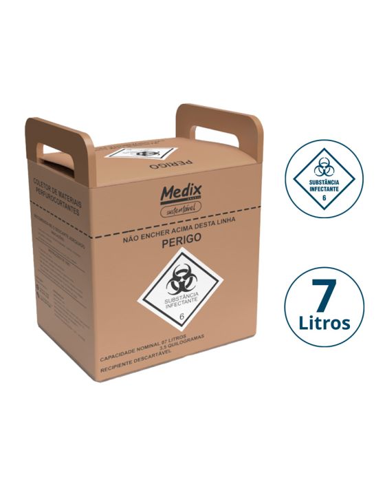Características:A Caixa Coletor Perfuro-Cortante Sutentável 7L Medix é ideal para coleta de resíduos hospitalares, materiais infectantes, perfurantes e cortantes e pode ser aplicado em diversas áreas da saúde, como hospitais, clínicas médicas e odontológicas, laboratórios, postos de aplicações de vacinas e demais locais que precisem deste tipo de coleta dos resíduos, prevenindo acidentes e contaminações.Detalhes:- Marca: Medix;- Referência: 5661;- Linha: Coletores hospitalares;- Tipo: Perfurocortantes;- Cor: Marrom;- Capacidade: 7 Litros;- Tamanho: 21,5 x 17 x 22cm (CxLxA);- Contem: 1 unidade do produto com 4 acessórios;- Acompanha: Bandeja interna, fundo, cinta interna e sacola amarela;- Espaço para identificação: Setor, Local, Data de validade e Assinatura;- Recipiente descartável;- Não estéril;- Produto de uso único.Indústria Brasileira. | Validade: 5 anos após a data de fabricação impressa no produto.Ideal para:- Hospitais, Clínicas Médicas e Odontológicas e Laboratórios e demais locais que precisam de coleta de materiais perfurocortantes.Montagem da caixa:- Manual em vídeo para montagem: https://www.youtube.com/watch?v=V5O4Cy3pan4.Modo de uso:- Preencher somente até a linha pontilhada;- Não manuseie, reencape ou entorte as agulhas usadas;- Não desconecte a agulha da seringa, descarte o conjunto completo;- Após a utilização, fechar travando o lacre para fechamento;- Durante o transporte mantenha o coletor afastado do corpo.Orientações:- Descartável e de uso único;- Proibido reprocessar;- Armazenar e conservar em local seco e arejado protegendo do calor, umidade e da luz.Composição:- Coletor e Bandeja interna fabricado em papelão ondulado; - Sacola de revestimento fabricado em polietileno; - Fundo e Cinta interna fabricado em papelão rígido.Medidas:- Dimensões do produto montado: 21,5 x 17 x 22cm (CxLxA);- Dimensões do produto desmontado: 50,9 x 38,5 x 0,5cm (CxLxA);- Peso: 275g.Autorização Anvisa: AFE 804955-1.ATENÇÃO: PRODUTO ENVIADO DESMONTADO. PROIBIDO REPROCESSAR, DESTRUIR APÓS O USO!* As especificações podem ser alteradas sem aviso prévio ** Imagem meramente ilustrativa.