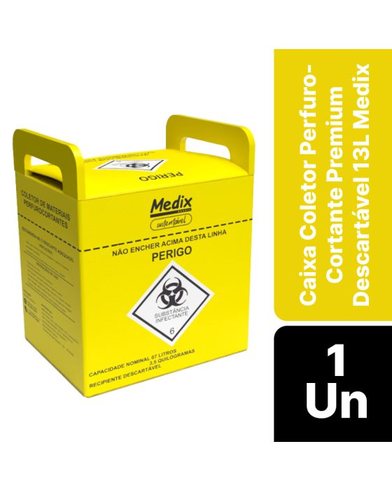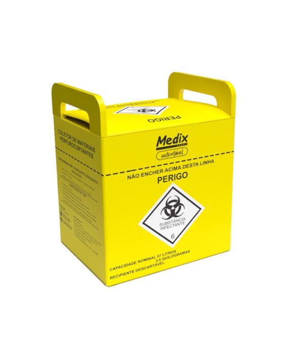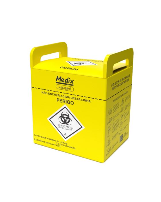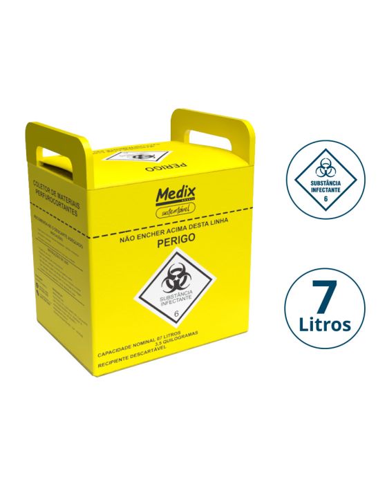 Características:- Capacidade ideal: Coletor descartável rígido com capacidade para 7 litros, projetado para o descarte seguro de resíduos perfurantes e cortantes infectantes. Fabricado com estrutura reforçada, é indicado para ambientes com exigência de biossegurança, como hospitais, clínicas e laboratórios.- Estrutura e Material: Produzido em papelão ondulado de alta resistência, conta com revestimento interno em polietileno, o que garante impermeabilidade e segurança contra vazamentos. Inclui cinta interna de reforço e bandeja impermeável, proporcionando maior estabilidade e proteção durante o uso.- Aplicação Profissional: Indicado para o descarte de seringas, agulhas, lâminas de bisturi, ampolas, fragmentos ósseos e vidros contaminados. Atende às normas de descarte de resíduos do grupo A6. - Onde usar: Ideal para consultórios, laboratórios, unidades hospitalares e odontológicas.- Segurança e Funcionalidade: Conta com sistema de montagem prática, com abas inferiores de travamento, inserção do saco plástico, tabuleiro, cinta e bandeja interna. A linha de enchimento demarcada orienta o limite de descarte. O fechamento é feito por lacre seguro, permitindo o descarte final conforme as regulamentações ambientais. Não reutilizável e não empilhável, conforme instrução do fabricante.- Sustentabilidade e Armazenamento: Produto com validade de 5 anos, fabricado com materiais reciclados e recicláveis. Deve ser armazenado em local seco, ventilado, protegido do calor, umidade e luz solar.- Marca: Fabricado pela Medix, empresa especializada em soluções para biossegurança e controle de infecção hospitalar. Seus produtos atendem às normas técnicas vigentes, com foco em segurança, durabilidade e responsabilidade ambiental.Dimensões do produto montado:Comprimento: 21,5cm;Largura: 17cm;Altura: 22cm;Peso: 3,5kg.* As especificações podem ser alteradas sem aviso prévio ** Imagem meramente ilustrativa.