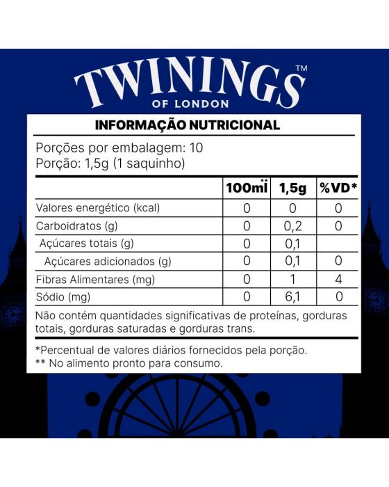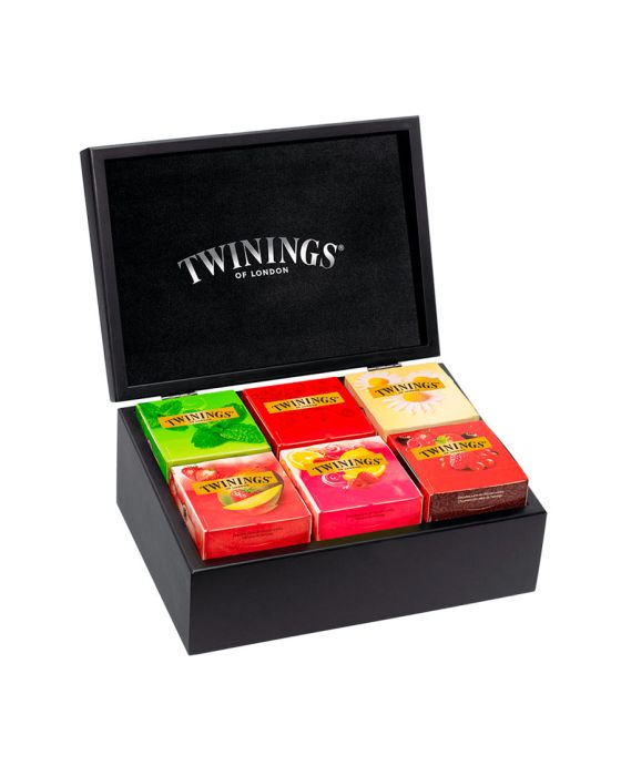 Características:- Seleção refinada com design elegante: A Caixa de Madeira Twinings com 60 sachês reúne uma seleção exclusiva de chás premium em um estojo sofisticado, ideal para recepções, escritórios, hotéis ou uso doméstico. Com fecho invisível que garante acabamento limpo e discreto, a caixa é também um item de apresentação e organização, além de oferecer fácil acesso aos sachês.- Variedade de sabores e qualidade reconhecida: Esta edição especial oferece 6 sabores distintos, cuidadosamente desenvolvidos pela tradicional marca britânica Twinings, referência mundial em chás desde 1706. São 60 sachês embalados individualmente, mantendo o frescor e a integridade dos aromas e ingredientes: 10 sachês de Chá de Limão com Gengibre – 1,5g cada; 10 sachês de Chá Preto Lady Grey – 2g cada; 10 sachês de Chá Preto English Breakfast – 2g cada; 10 sachês de Chá de Camomila com Mel, Baunilha e Caramelo – 1,5g cada; 10 sachês de Chá Verde – 2g cada; 10 sachês de Chá de Laranja Natural, Manga e Canela – 1,8g cada.- Modo de preparo recomendado: Chá verde: Infusão por 2 minutos em 200ml de água fervente e Demais sabores: Infusão por 3 a 4 minutos em 200ml de água fervente (Essa orientação garante o melhor aproveitamento dos compostos naturais e do sabor de cada chá).- Aplicações recomendadas: Ideal para ambientes corporativos, salas de espera, reuniões, coffeebreaks e também para uso pessoal. A diversidade de sabores atende a diferentes preferências, oferecendo desde opções relaxantes até chás mais encorpados e estimulantes.- Sobre a marca: Twinings: Com mais de 300 anos de história, a Twinings é sinônimo de tradição e qualidade na produção de chás. Reconhecida internacionalmente, combina ingredientes selecionados e técnicas clássicas para oferecer experiências únicas em aroma, sabor e bem-estar.- Informação nutricional e alergênicos:Não contém glúten. Contém aromatizante sintético idêntico ao natural.- Dimensões da embalagem:Comprimento: 22,5cm;Largura: 6,3cm;Altura: 9,3cm;Peso: 350g.* As especificações podem ser alteradas sem aviso prévio ** Imagem meramente ilustrativa.