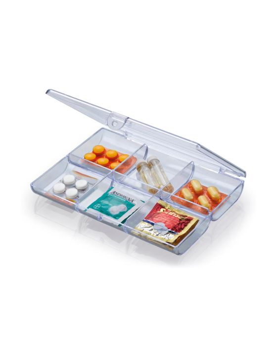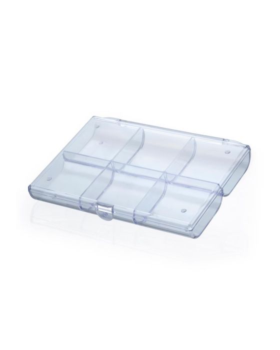 Caracteristicas:- Caixa prática e funcional para as mais diversas utilizações no escritório ou em casa como: organizar bijuterias, medicamentos, pequenos objetos, etc.- Possui 6 divisórias- Tampa com fecho por pressão- Produzida em poliestireno crital- Medidas: 2,5x13x18,1cm * As especificações podem ser alteradas sem aviso prévio ** Imagem meramente ilustrativa