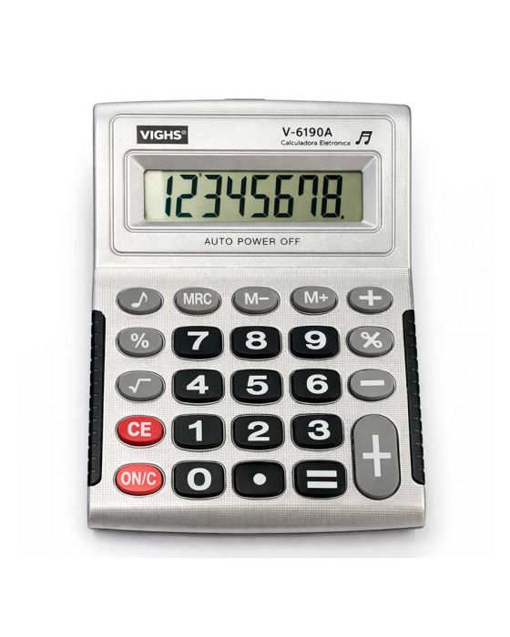 Características:- Calculadora de mesa 8 dígitos com visor LCD inclinado e funções de memória: A Calculadora de Mesa V-6190 da Vighs foi desenvolvida para oferecer praticidade e precisão em operações matemáticas do dia a dia. Com visor LCD inclinado de 8 dígitos, proporciona melhor visualização dos resultados, sendo indicada para uso em escritórios, comércios, ambientes administrativos e rotinas escolares.- Estrutura compacta com design funcional: Produzida em plástico com componentes eletrônicos resistentes, a calculadora apresenta design compacto na cor prata com detalhes em preto, proporcionando aparência moderna e discreta para diferentes ambientes de trabalho. Seu formato de mesa facilita o uso contínuo em superfícies de trabalho.- Funções essenciais e memória independente: O modelo oferece funções básicas de cálculo, incluindo operações matemáticas fundamentais, cálculo de porcentagem e raiz quadrada. Conta também com memória independente por meio das teclas M+, M- e MRC, permitindo armazenar e recuperar valores durante operações sequenciais, aumentando a eficiência em cálculos repetitivos.- Sistema sonoro com opção de ativar ou silenciar: A calculadora possui sistema sonoro nas teclas, proporcionando retorno auditivo durante a digitação. Caso necessário, o usuário pode ativar o modo mudo através da tecla específica, adaptando o uso a diferentes ambientes de trabalho.- Alimentação por pilha com desligamento automático: O equipamento é alimentado por uma pilha botão LR1130 (inclusa), garantindo funcionamento imediato. Conta ainda com sistema Auto Power Off, que desliga automaticamente a calculadora após período de inatividade, contribuindo para economia de energia.- Sobre a marca Vighs: A Vighs atua no segmento de suprimentos para escritório, oferecendo produtos funcionais voltados à organização, cálculo e produtividade em ambientes profissionais e educacionais, com foco em praticidade e bom custo-benefício.- Itens inclusos na embalagem: 1 Calculadora V-16190 Vighs e 1 Pilha Botão LR1130.- Dimensões do produto:Comprimento: 15,5cm;Largura: 11cm;Altura: 4cm;Peso: 125g.* As especificações podem ser alteradas sem aviso prévio ** Imagem meramente ilustrativa.