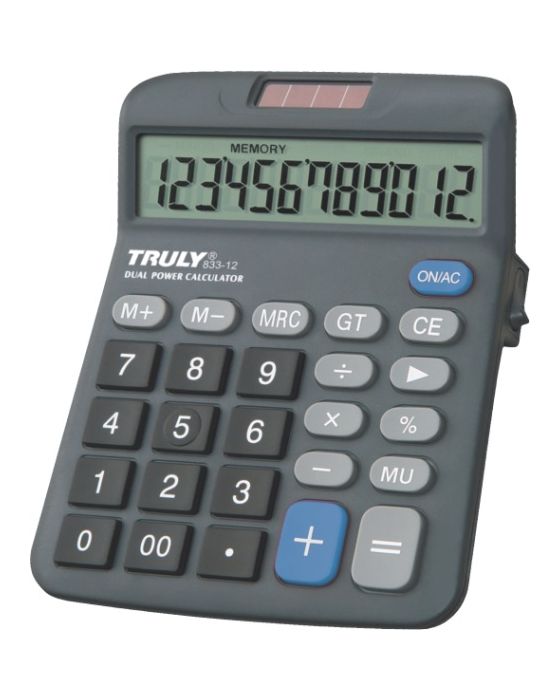 Características:A calculadora 833-12 da Truly funciona atraves de uma bateria e energia solar, que proporciona longevidade a vida útil da bateria. Este produto é para ser utilizado em cima de uma mesa, seu visor LCD é inclinado justamente para ter a melhor visualização possível independente do ângulo de visão. Detalhes:- Marca: Truly;- Modelo: 833-12;- Linha: Calculadoras de mesa;- Cor: Cinza;- Dígitos: 12 dígitos;- Contém: 1 unidade do produto;- Alimentação: Bateria e pilha AA;- Memória;- Porcentagem;- Duplo zero;- Backspace;- Gran Total;- Mark Up;- Tecla Power / On.Medidas:- Dimensões do produto: 19,5 x 13 x 3,6cm (CxLxA);- Dimensões da embalagem: 16 x 12,5 x 4cm (CxLxA);- Peso: 187g.* As especificações podem ser alteradas sem aviso prévio ** Imagem meramente ilustrativa.