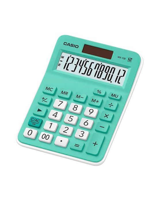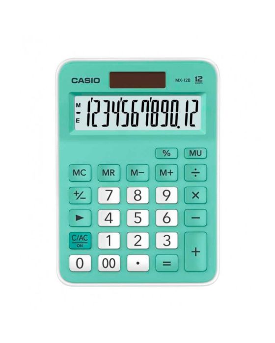 Características:Quando o assunto é máxima precisão durante os cálculos, a MX-12B-GN da Casio é a opção perfeita. Para o trabalho, estudos ou qualquer outra tarefa que exija cálculos, essa incrível calculadora supre todas as necessidades com total desempenho e rapidez nos resultados, sendo a sua maior aliada!A embalagem é inspirada no verde esmeralda do mar.Detalhes:- Marca: CASIO;- Modelo: MX-12B-GN;- Linha: Calculadoras de mesa;- Cor: Verde Claro;- Contém: 1 unidade do produto;- Visor 12 Dígitos;- Alimentação dupla inteligente.Gerais:- Tipo de produto: Tipo Mini de mesa;- Número de dígitos: 10 + 2 dígitos;- Visor de cristal líquido: Amplo visor / Marcadores de vírgula a cada 3 dígitos;- Principais características: Teclas plásticas;- Função das teclas: Função das teclas / Teclado com memória / Tecla Shift (?) / Troca de sinal (+/-) / Mark-up.Funções de cálculo:- Cálculo básico: Cálculo básico / Percentual básico (%).Alimentação de energia- Solar e pilha.Memória:- Independente.Medidas:- Dimensões do produto: 14,7 x 10,65 x 2,9cm (LxPxA);- Peso: 115g.Garantia do fornecedor: 1 ano contra defeitos de fabricação.* As especificações podem ser alteradas sem aviso prévio ** Imagem meramente ilustrativa