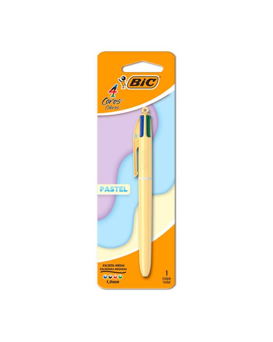 Características:Mais alegria e cor para suas tarefas diárias! A caneta BIC 4 cores é um ícone de mercado! Nesse modelo, com apenas um clique no botão, você seleciona a cor que deseja.Ela possui corpo em tom pastel, dando um ar despojado e refinado a essa caneta tão tradicional da BIC. Conta com escrita média com ponta de 1.0mm e largura da linha de 0.4mm, além disso, não trava durante o uso!4 cores de tinta em um só produto; escrita media com ponta de 1.0mm com esfera de tungstênio.Detalhes:- Marca: BIC;- Modelo: 4 Cores;- Referência: 9309983;- Linha: Caneta Esferográfica;- Cores da tinta: Azul, Preta, Vermelha e Verde;- Cor do corpo: Azul pastel, Lilás pastel e Amarelo pastel (Cores sortidas);- Ponta: Média 1,0mm;- Contém: 1 Blister com 1 unidade do produto;- 4 cores de tinta em um só produto;- Não trava durante o uso;- Com esfera de tungstênio;- Ícone de mercado;- Design atraente.Fabricado no França. | Validade: Indeterminada.Composição:- Resinas termoplásticas, Tinta à base de corantes orgânicos e solventes, ponta de latão, esfera de tungstênio e componentes metálicos.- Medidas:- Dimensões da embalagem: 20,4 x 6,6 x 1,5cm (CxLxA);- Peso: 100g.ATENÇÃO! NÃO RECOMENDÁVEL PARA CRIANÇAS DE ATÉ 3 (TRÊS) ANOS POR CONTER PARTE(S) PEQUENA(S) QUE PODEM SER ENGOLIDA(S) OU ASPIRADA(S). CRIANÇAS DE ATÉ 8 ANOS DEVEM UTILIZAR SOB SUPERVISÃO DE UM ADULTO POR CONTER PONTA(S) AGUDA(S) FUNCIONAL(IS).Cores sortidas, será enviado de acordo com a disponibilidade do estoque. Não é possível escolher uma cor específica.* As especificações podem ser alteradas sem aviso prévio ** Imagem meramente ilustrativa.