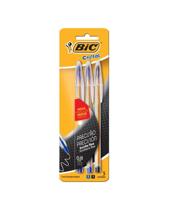 Caneta Esferografica Cristal Fina 0.8mm Bls C/3 2 Azul- 1 Preta Bic