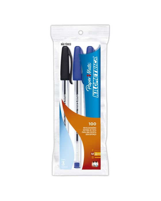 Caneta Esferografica Kilometrica 1.0mm Bls C/3 -2 Azul 1 Preta Paper Mate