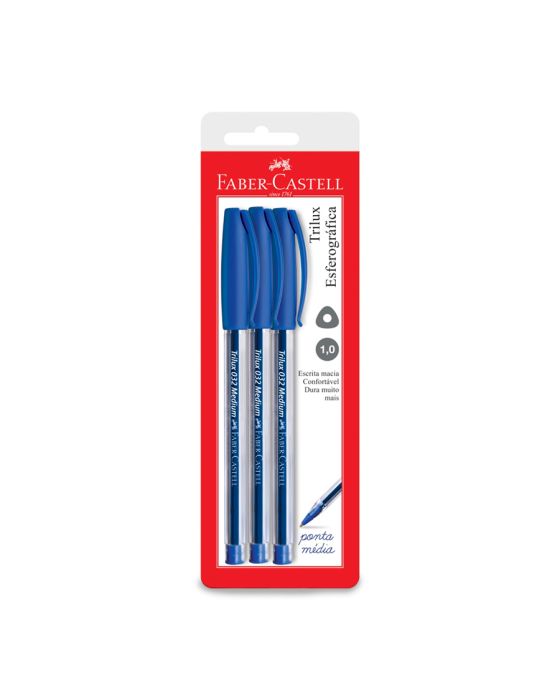Características:As canetas esferográficas Trilux tem o formato triangular ergonômico, que garante conforto e melhor escrita. Sua ponta de 1.0mm proporciona uma escrita macia, sem falhas ou borrões.Detalhes:- Marca: Faber-Castell;- Modelo: Trilux;- Referência: SM/032AZ;- Linha: Canetas Esferográficas;- Cor: Azul;- Ponta: 1,0mm;- Contém: 1 blister com 3 unidades do produto;- Formato: Triangular;- Maior precisão no traço;- Escrita macia, sem falhas ou borrões;- Tampa antiasfixiante;- Garantia de conforto e melhor escrita;- Dura muito mais.* As especificações podem ser alteradas sem aviso prévio ** Imagem meramente ilustrativa.