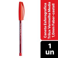 Características:As canetas esferográficas Trilux tem o formato triangular ergonômico, que garante conforto e melhor escrita. Sua ponta de 1.0mm proporciona uma escrita macia, sem falhas ou borrões.Detalhes:- Marca: Faber-Castell;- Modelo: Trilux;- Referência: 032/VM;- Linha: Canetas Esferográficas;- Cor do corpo: Transparente;- Cor da tinta: Vermelha;- Cor da tampa: Vermelha;- Ponta: 1,0mm;- Contém: 1 unidade do produto;- Formato: Triangular;- Maior precisão no traço;- Escrita macia, sem falhas ou borrões;- Tampa antiasfixiante;- Garantia de conforto e melhor escrita;- Dura muito mais.* As especificações podem ser alteradas sem aviso prévio ** Imagem meramente ilustrativa.
