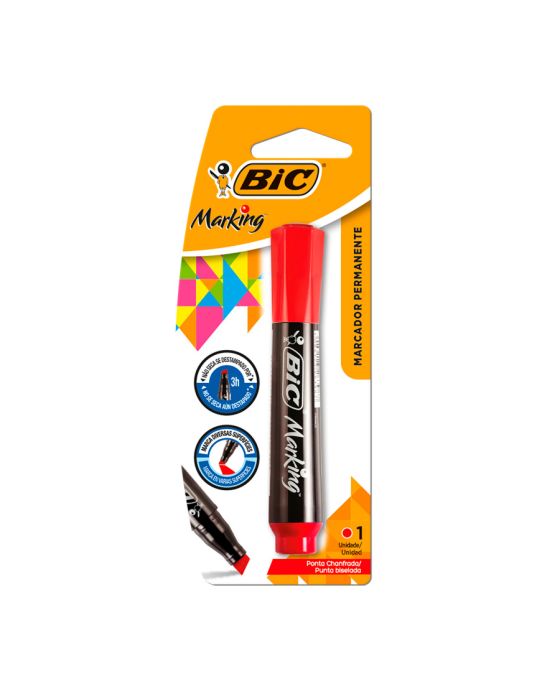 Características:- Desenvolvida para atender com excelência profissionais e usuários exigentes, a Caneta Marcador Permanente BIC Marking Vermelho com blister de uma unidade é ideal para marcações em superfícies diversas com alta precisão e durabilidade. Sua ponta chanfrada bloqueada permite traços finos ou grossos, variando entre 1,5 mm e 3,0 mm, adaptando-se a diferentes aplicações, desde trabalhos manuais até uso industrial leve. A tinta à base de álcool garante secagem rápida, minimizando riscos de borrões e promovendo um acabamento limpo e profissional.- Desempenho técnico e durabilidade: Projetada com ponta chanfrada de alta resistência, bloqueada para evitar retrações durante o uso, a caneta proporciona maior vida útil e desempenho constante. A versatilidade do traço (1,5 mm a 3,0 mm) atende desde detalhes mais delicados até coberturas maiores, com controle total pelo usuário.- Aplicação em diversas superfícies: Recomendada para marcar papelão, madeira, vidro, plástico, metal, acrílico e porcelana, essa caneta é indicada para uso em escritórios, escolas, ambientes industriais e atividades de artesanato. A tinta permanente fixa com firmeza e mantém legibilidade mesmo em materiais mais desafiadores.- Tinta à base de álcool – secagem rápida e sem borrões: Sua fórmula à base de álcool promove secagem instantânea, tornando o produto ideal para uso contínuo, sem interrupções, e para atividades que demandam precisão e limpeza.- Marca de confiança: A BIC é referência global em soluções de escrita, combinando tradição e inovação em produtos acessíveis e de alta performance.- Dimensões da embalagem:Comprimento: 12cm;Largura: 1,8cm;Altura: 1,8cm;Peso: 18g.ATENÇÃO! NÃO RECOMENDÁVEL PARA CRIANÇAS DE ATÉ 3 (TRÊS) ANOS POR CONTER PARTE(S) PEQUENA(S) QUE PODEM SER ENGOLIDA(S) OU ASPIRADA(S). * As especificações podem ser alteradas sem aviso prévio ** Imagem meramente ilustrativa.