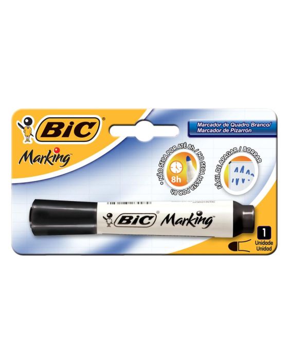 Características:Escreva e apague o quadro branco com facilidade graças ao Marcador Quadro Branco BIC Marking! Fácil de apagar apesar da cor da tinta ser bem viva. Sua ponta redonda é muito resistente, possibilita uma escrita firme, sem afundar. Seu design é diferenciado. A BIC oferece excelentes produtos para acompanhar o volta ás aulas com excelência e liderança.Detalhes:- Marca: Bic;- Modelo: BIC Marking;- Referência: 904204;- Linha: Canetas Quadro Branco;- Cores: Verde claro, Azul turquesa, Rosa e Roxa;- Ponta: Redonda;- Traço: 2 - 6mm;- Contém: 1 blister com 4 cores do produto;- Formato corpo: Redondo;- Não seca mesmo sem tampa por até 6 horas;- Cores vivas;- Recarregável;- Fácil de apagar;- Marca super vísivel.Fabricado no Brasil | Prazo de validade indeterminado.Ideal para:- Ideal para escrever em quadro branco.Composição:- Fabricado em Ponta redonda de poliéster, tinta a base de álcool, feltro: poliéster, corpo: plástico.Armazenamento:- Armazenar na posição horizontal. Após o uso tampe;- Evite altas temperaturas e exposição direta aos raios solares;- Armazenar em local seco e arejado.Conteúdo: 1 Caneta Quadro Branco Preta Bls C/1 Bic.ATENÇÃO! NÃO RECOMENDÁVEL PARA CRIANÇAS DE ATÉ 4 (QUATRO) ANOS POR CONTER PARTE(S) PEQUENA(S) QUE PODE(M) SER ENGOLIDA(S) OU ASPIRADA(S) E PONTA(S) AGUDA(S) FUNCIONAL(IS). CRIANÇAS ENTRE 5 (CINCO) E 8(OITO) ANOS SOMENTE DEVE UTILIZAR SOB SUPERVISÃO DE UM ADULTO.* As especificações podem ser alteradas sem aviso prévio ** Imagem meramente ilustrativa.