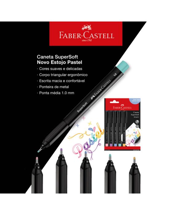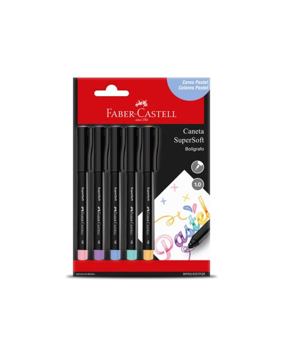 Caracteristicas:As canetas super soft proporcionam uma experiência muito confortável ao escrever..Detalhes:- Marca: Faber-Castell.- Modelo: BPSS/ESTPZF.- Linha: Canetas SuperSoft.- Cores: 5 cores (rosa pastel, lilás pastel, azul pastel, verde pastel e laranja pastel).- Contém: 1 blister com 5 canetas com cores mistas.- Corpo triangular ergonômico.- Ponta: média 1.0mm.- Ponteira metálica.- Perfeita para técnicas de Lettering e desenhos artísticos.- Tinta lavável e atóxica.- Embalagem 100% ecológica.- Tinta vibrante que não passa para o outro lado da folha em gramaturas acima de 90g.* As especificações podem ser alteradas sem aviso prévio ** Imagem meramente ilustrativa.
