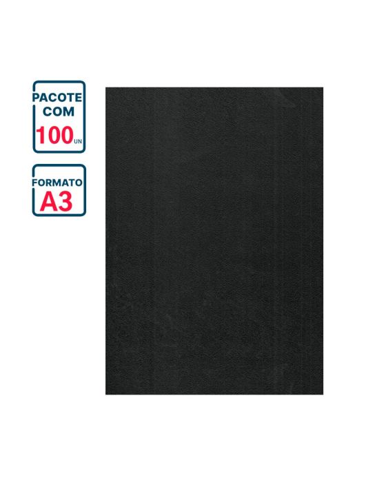 Características:A Capa Encadernacao A3 Preta Plaspiral é ideal para a encadernação de livros, cadernos e apostilas, deixando mais resistentes!Detalhes:- Marca: Plaspiral;- Linha: Capa para encadernação;- Cor: Preto;- Textura: Fosco;- Quantidade de folhas: 100 folhas;- Formato: A3;- Medidas: 297 x 420mm (29,7 x 42cm);- Contém: 1 embalagem com 100 unidades do produto;- Ideal para cadernos, apostilas e lista de preços.* As especificações podem ser alteradas sem aviso prévio ** Imagem meramente ilustrativa.