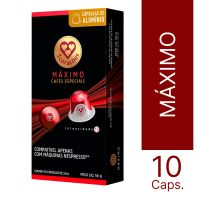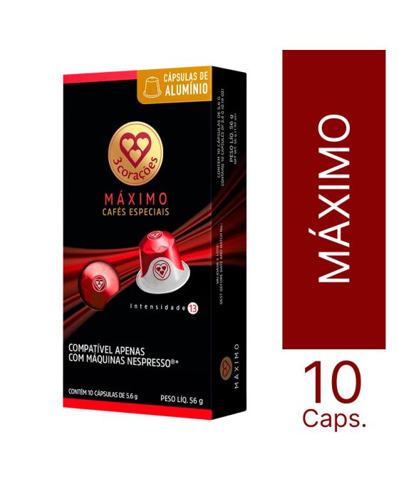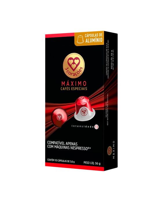 Características:Um blend que combina a evolução dos Robustas Amazônicos e a tradição dos Arábicas Naturais, produzidos no Sul de Minas Gerais, resultando na união perfeita para uma torra escura de sabor complexo e encorpado. Cada cápsula deste Espresso entrega uma xícara aveludada e cremosa, com um corpo extremamente intenso, amargor agradável e notas de madeira e chocolate amargo. Apresenta intensidade 13, a maior da linha de Compatíveis 3 Corações.Detalhes:- Marca: Três Corações;- Sabor: Máximo;- Tipo: Espresso;- Linha: Cápsula de Café;- Peso: 56g;- Contém: 1 embalagem com 10 cápsulas de 5g cada.- Compatível com: Nespresso®*;- Intensidade: 13;- Cápsula de alumínio;- Predominatemente Arábica.Indústria Brasileira.Perfil Aromático:- Torra: Escura;- Origem: Sul de Minas Gerais;- Corpo: Extremamente intenso;- Acidez: Agradável.Notas Aromáticas:- Notas: Madeira e chocolate amargo.Faz:- Espresso: 40ml.Ingredientes:- Café torrado e moído.Conservação:- Conservar em local seco, fresco e inodoro.Medidas:- Dimensões da embalagem: 15,5 x 7,8 x 3cm (CxLxA);- Peso: 56g. * As novas cápsulas Três Corações são compatíveis APENAS com as máquinas Nespresso®.ATENÇÃO: NÃO CONTÉM GLÚTEN.*Nespresso® é uma marca registrada pela Société des Produits Nestlé S.A. e este produto não é afiliado ou aprovado pela Nestlé S.A.**As especificações podem ser alteradas sem aviso prévio *** Imagem meramente ilustrativa.