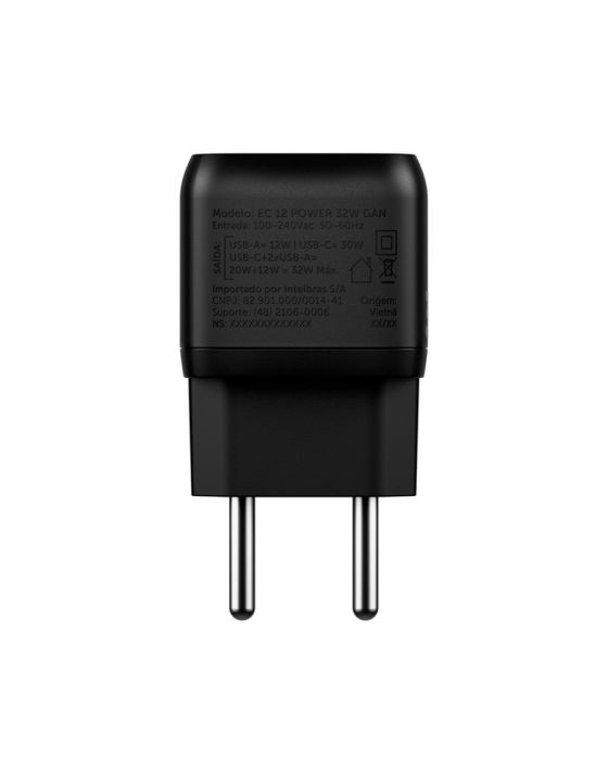 Características:- Carregador USB de 3 portas com tecnologia Power Delivery e potência de 32W: O Carregador EC12 Power 32W da Intelbras foi desenvolvido para oferecer carregamento rápido e eficiente para diversos dispositivos eletrônicos. Equipado com três portas USB, duas USB-A e uma USB-C permite alimentar até três dispositivos simultaneamente, oferecendo praticidade e versatilidade no uso diário.- Tecnologia de carregamento rápido com Power Delivery: A porta USB-C conta com tecnologia Power Delivery (PD), fornecendo potência máxima de até 30W, permitindo carregamento até três vezes mais rápido quando comparado a carregadores convencionais. Essa tecnologia garante maior eficiência no fornecimento de energia para smartphones, tablets, fones de ouvido e outros dispositivos compatíveis.- Compatibilidade ampla e carregamento simultâneo: Projetado para atender diferentes tipos de equipamentos, o carregador é compatível com qualquer dispositivo que utilize conexão USB. A distribuição inteligente de energia permite carregar até três dispositivos ao mesmo tempo, mantendo estabilidade e segurança durante o uso.- Sistema de proteção e construção segura: O modelo possui proteção contra surtos de tensão, sobrecarga e variações elétricas, contribuindo para maior segurança dos dispositivos conectados. Sua estrutura é construída em plástico antichamas, aumentando a resistência e a confiabilidade do equipamento. Conta ainda com entrada bivolt automática (100–240V), permitindo utilização em diferentes redes elétricas.- Sobre a marca Intelbras: A Intelbras é referência nacional em soluções tecnológicas, reconhecida pela confiabilidade, inovação e rigor técnico em seus produtos.- Itens inclusos na embalagem: 1 Cabo USB para Lightning Preto Intelbras.- Garantia do fornecedor: 3 anos contra defeitos de fabricação.- Dimensões da embalagem:Comprimento: 7,15cm;Largura: 4,05cm;Altura: 3,8cm;Peso: 75g.* As especificações podem ser alteradas sem aviso prévio ** Imagem meramente ilustrativa.