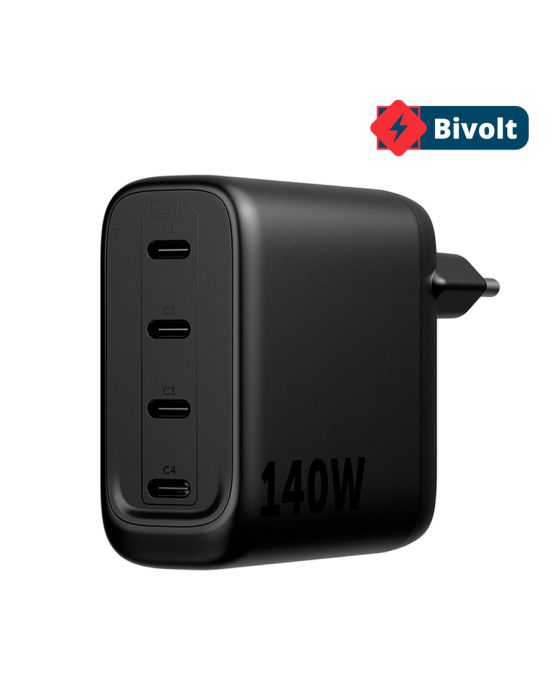 Características:- O Carregador EC40 Power 140W GaN é uma solução de alta potência para carregamento simultâneo de múltiplos dispositivos. Equipado com 4 portas USB-C, oferece potência total de até 140W com tecnologia Power Delivery (PD), permitindo alimentar notebooks, MacBooks, smartphones e periféricos com eficiência e estabilidade.- Carregamento ultrarrápido para até 4 dispositivos simultaneamente: Projetado para carregar até 2 notebooks de até 65W simultaneamente ou até 4 dispositivos compatíveis via USB-C, distribui a potência de forma inteligente (70W divididos entre C1 e C2 + 70W divididos entre C3 e C4, totalizando 140W máximo). A tecnologia GaN proporciona maior eficiência energética e menor aquecimento, mantendo o desempenho mesmo em uso contínuo.- Segurança elétrica e construção antichamas: Conta com proteção contra surtos de tensão e sobrecarga, garantindo carregamento seguro. Fabricado em plástico antichamas, atende aos requisitos de segurança para uso residencial e corporativo. Possui entrada bivolt automático (100 ~ 240Vca 50/60Hz), ideal para uso em diferentes padrões de rede elétrica. Consumo em stand by de apenas 0,3W.- Ideal para estações de trabalho e viagens: Indicado para estações de trabalho que necessitam de múltiplas fontes de alimentação, proporcionando ambiente mais organizado e “clean”. Também é compacto e adequado para viagens, substituindo diversos carregadores por uma única solução de alta potência.- Sobre a marca Intelbras: A Intelbras é referência nacional em soluções tecnológicas, reconhecida pela confiabilidade, inovação e rigor técnico em seus produtos.- Itens inclusos na embalagem: 1 carregador com 4 portas USB-C Intelbras.- Garantia do fornecedor: 3 anos contra defeitos de fabricação. - Dimensões do produto: Comprimento: 11,7cm;Largura: 3,2cm;Altura: 7cm;Peso: 334g.* As especificações podem ser alteradas sem aviso prévio ** Imagem meramente ilustrativa.