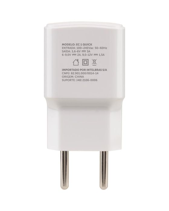 CaracteristicasO EC 1 Quick é um carregador USB homologado com a tecnologia Qualcomm Quick Charge 3.0, que proporciona carregamento até 3 vezes mais rápido. Ideal para recarregar a bateria de smartphones, tablets, fones de ouvido, power banks, smartwatches, caixas de som portátil, e outros dispositivos com conexão USB. Fornece carregamento seguro, com proteção contra surtos de tensão e sobrecarga.- Carregamento até 3 vezes mais rápido- Compatível com qualquer dispositivo com conexão USB- Homologação Qualcomm Quick Charge 3.0- Não vicia a bateria do dispositivo- Proteção contra surtos de tensão e sobrecargaEspecificações técnicas- Entrada: 100 à 240Vca 50/60Hz 0,6A máx. (bivolt automático)- Saída: USB-A Quick Charge: 3,6-6V / 3A. 6-9V / 2A. 9-12V / 1,5A- Temperatura em operação: 0 à 40ºC- Temperatura em armazenamento: -40 à 70ºC- Dimensão do produto (L×A×P): 38,5 × 22 × 60,5 mm- Peso do produto: 45 g- Dimensão da embalagem (L×A×P): 136 × 195 × 33,5 mm- Peso da embalagem: 90 g* As especificações podem ser alteradas sem aviso prévio ** Imagem meramente ilustrativa.