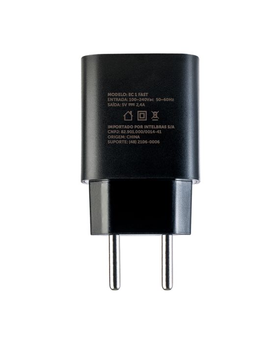 Características:O EC 1 Fast é um carregador USB com saída de 2,4 A, que proporciona carregamento até 2 vezes mais rápido. Ideal para recarregar a bateria de smartphones, tablets, fones de ouvido, power banks, smartwatches, caixas de som portátil, e outros dispositivos com conexão USB. Fornece carregamento seguro, com proteção contra surtos de tensão e sobrecarga.Detalhes:- Marca: Intelbras;- Modelo: EC 1 Fast Rápido;- Linha: Carregadores de parede;- Tipo: de Parede;- Voltagem: Bivolt;- Potência: 12W;- Cor: Preto;- Saída: USB-A;- Contém: 1 unidade do produto;- Carregador universal;- Carregamento até 2 vezes mais rápido;- Não vicia a bateria do dispositivo;- Proteção contra surtos de tensão e sobrecarga;- Material Anti-chamas.Fabricado na China. | Validade: Indeterminada.Diferenciais:- Eficiência e praticidade com carregamento rápido: Com a EC1 Fast, você carrega seus dispositivos USB até 2 vezes mais rápido¹ (2,4 A) e ainda tem proteção contra surtos de tensão e sobrecarga;- Bivolt automático: Utilize o EC1 Fast em qualquer lugar do mundo sem risco de queimar o equipamento carregado;- Proteções: A fonte carregadora EC1 Fast possui um circuito adicional de proteção contra surtos de tensão e sobrecarga, garantindo mais proteção para os produtos.Onde usar:- Pode ser usado em residências, apartamentos, empresas e escritórios.Compatibilidade:- Compatível com qualquer dispositivo com conexão USB.Energia:- Entrada: 100 à 240Vca 50/60Hz 0,6 A máximo (bivolt automático)- Saída: USB-A: 5 V ? 2,4 A (máximo)- Corrente máxima: 2,4 A;- Consumo em Stand By: 0.1 W.Composição;- Fabricado em Plástico, Metal e Componentes eletrônicos.Medidas:- Dimensões do produto: 8 x 2,88 x 4,1cm (CxLxA);- Dimensões da embalagem: 11,5 x 6 x 3,2cm (CxLxA);- Peso: 76g.Conteúdo da embalagem: 1 Carregador USB preto.Garantia do fornecedor: 1 ano contra defeitos de fabricação.* As especificações podem ser alteradas sem aviso prévio ** Imagem meramente ilustrativa.