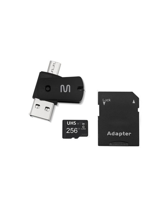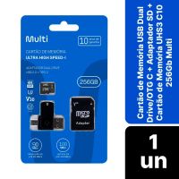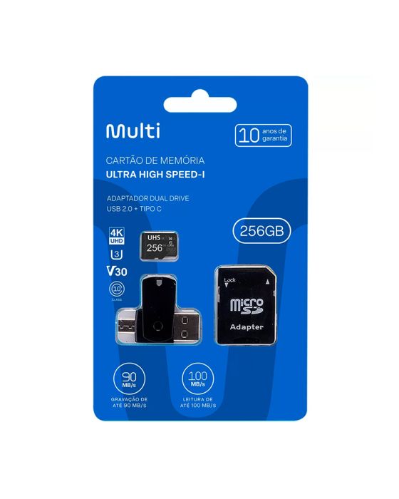 Características:Salve mais fotografias de alta qualidade e vídeos 4K com o cartão Ultra Hight Speed da Multi. Com capacidade de armazenamento de 256GB, você pode tirar mais fotos e classificação de vídeo Classe 3 (U3) e Classe 10 para gravação de vídeo de alta qualidade.Detalhes:- Marca: Multi;- Modelo: Kit 3 em 1;- Referência: MC154;- Linha: Cartão de memória;- Cor: Preto;- Capacidade: 256gb;- Contém: 1 unidade do produto; - Leitura de até 100MB/s;- Gravação até 90MB/s de leitura.- Ideal para smartphones, tablet Android e drones DJI;- Ideal para gravação de vídeos em 4K;- Utilize como cartão de memória, Pen Drive USB + OTG ou Cartão SD.Leitor de Cartão:- Compatibilidade: USB 2.0 e Adaptador Tipo C;- Taxa de transferência: Até 480MB/s.Cartão de Memória:- Durabilidade: À Prova de água, choque, vibração e temperaturas extremas;- Taxa de transmissão de dados: Até 90MB/s (Gravação) e até 100MB/s (Leitura);- Voltagem de operação: 2,7V ~3,6V.Ideal para:- Ideal para seu smartphone Android™, câmeras de ação ou drones.Composição: - Fabricado em material plástico, metálicos e componentes eletrônicos.Medidas:- Dimensões Leitor de Cartão: 3,1 x 2,2 x 0,9cm (CxLxA);- Dimensões Cartão de Memória: 1,5 x 1,1 x 0,1cm (CxLxA);- Dimensões do produto: 14,5 x 9 x 0,05cm (CxLxA);- Peso Leitor de Cartão: 3g;- Peso Cartão de Memória: 2,5g;- Peso: 14g.Conteúdo da embalagem: 1 Cartão de Memória 256gb, 1 Adaptador para cartão de memória e 1 Adaptador USB/OTG.Garantia do fornecedor: 10 anos contra defeitos de fabricação a partir da data de aquisição do produto.* As especificações podem ser alteradas sem aviso prévio ** Imagem meramente ilustrativa.