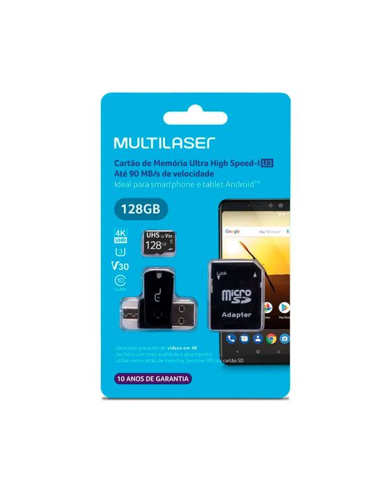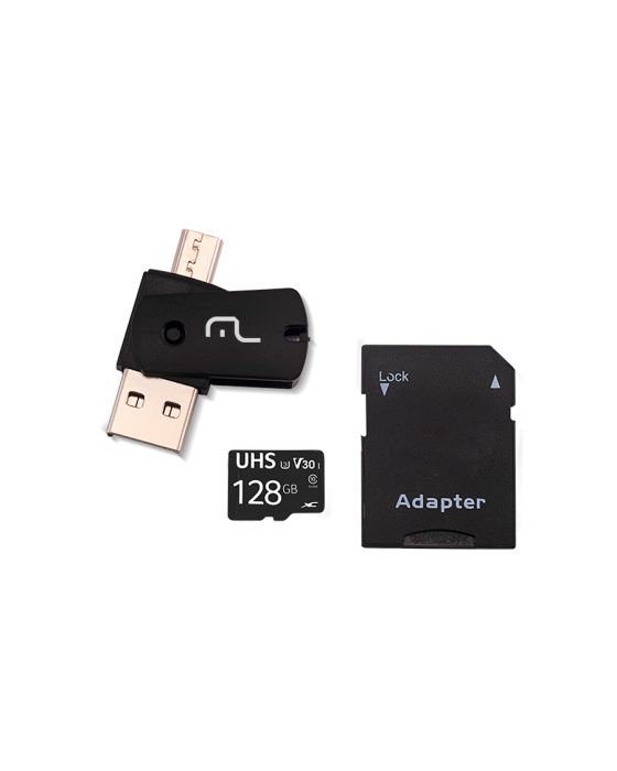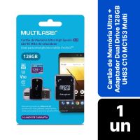 Características:Cartão de Memória Ultra High Speed U3 Até 90 MB/s de velocidade MC153 Ideal para seu smartphone Android™, câmeras de ação ou drones!Tire e salve mais fotografias de alta qualidade e vídeos 4K com o cartão Ultra High Speed da Multi. Com capacidade de armazenamento de 128GB, você pode tirar mais fotos e capturar mais vídeos sem ter que se preocupar com o espaço. Capture vídeos 4K sem cortes/interrupções nem falhas com este cartão de memória com classificação de vídeo Classe 3 (U3) e Classe 10 para gravação de vídeo de alta qualidade.Mova arquivos com facilidade entre outros dispositivos compatíveis com SD, como câmeras digitais e computadores. Capture, transporte e guarde todos seus momentos em um local acessível. Aumente a capacidade de armazenamento em até 128GB e não apague nada importante do seu dispositivo. Material à prova d'água, à prova de choque e à prova de temperaturas extremas.Detalhes:- Marca: Multi;- Modelo: Kit 4 em 1;- Referência: MC134;- Linha: Cartão de memória;- Cor: Preto;- Capacidade: 128gb;- Formato: MicroSD;- Contém: 1 unidade do produto; - Classe 3 (U3) e Classe 10;- Taxa de transmissão de dados: 40Mb/s de gravação e até 90Mb/s de leitura;- Durabilidade: à prova de choque, vibração e temperaturas extremas;- Voltagem de operação: 2,7V ~ 3,6V.Ideal para:- Ideal para seu smartphone Android™, câmeras de ação ou drones.Leitor de cartão- Compatibilidade: USB 2.0 e MicroUSB;- Taxa de transferência: Até 480Mb/s.Medidas:- Dimensões do produto: 14,5 x 9 x 0,05cm (CxLxA);- Peso: 14g.Conteúdo da embalagem: 1 Cartão de Memória 128gb, 1 Adaptador para cartão de memória e 1 Adaptador USB/OTG.Garantia do fornecedor: 10 anos contra defeitos de fabricação.* As especificações podem ser alteradas sem aviso prévio ** Imagem meramente ilustrativa.Adaptador USB Dual Drive/OTG C + Adaptador SD + Cartão de Memória UHS3 C10 256Gb Multi