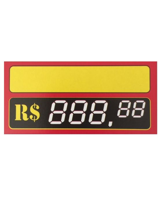 Caracteristicas:- Chame a atenção para o seu produto!!- Papel duplex 250 g/m2- Formato: 8,5 x 4,0cm- Caixa de preço formato digital de 5 dítigos para pintar- Cor predominante: amarelo com bordas em vermelho* As especificações podem ser alteradas sem aviso prévio ** Imagem meramente ilustrativa