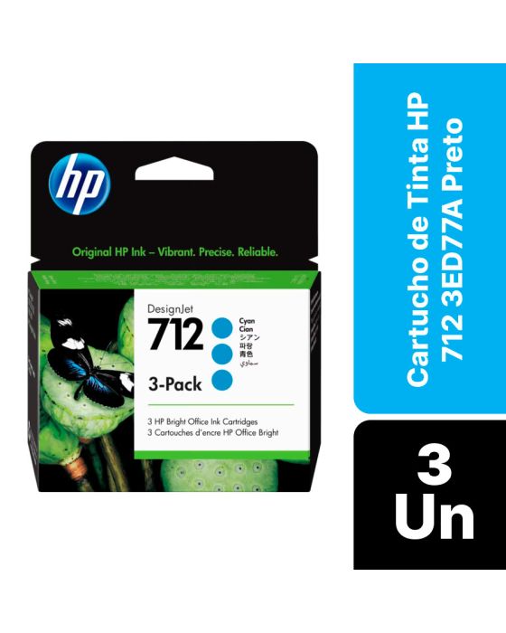 Características:Imprima documentos com cores nítidas e intensas. As tintas HP originais oferecem uma resistência extraordinária à descoloração e confiabilidade e desempenho superiores.A qualidade da HP que você conhece e confia agora mais acessível do que nunca. Imprima documentos e fotos resistentes à água e manchas e economize em impressão freqüente com os cartuchos originais HP.Detalhes:- Marca: HP;- Modelo: 712;- Referência: 3ED77A;- Linha: Cartuchos;- Cor: Ciano;- Volume cartucho: 29ml cada;- Contém: 1 embalagem com 3 unidades do produto;- Tecnologia de impressão: Jato de Tinta;- Produto Original.Fabricado na Malásia.Impressoras Compátiveis:- Modelos Impressora HP DesignJet T210, Impressora HP DesignJet T230, Impressora HP DesignJet T250, Impressora HP DesignJet T630, Impressora HP DesignJet T650 e Impressora HP DesignJet Studio.Medidas:- Dimensões embalagem: 12 x 4,7 x 12,5cm (CxLxA).Descarte de Cartuchos e Toners:- Você pode fazer o descarte com ajuda do ReCiclo, um projeto da Contabilista através da Contabilista Responsável, basta enviar os seus resíduos para a nossa Central de Distribuição*, se você é de Curitiba ou de Joinville, pode ir até uma de nossas lojas ou preencher o formulário disponível no site para solicitar retirada de materiais.Acesse o Link para verificar as marcas que reciclamos e nossos endereços: https://www.contabilistaresponsavel.com.br/reciclo.* Enviar conteúdo aos cuidados do Setor de Reciclagem.** Atenção: Cartuchos e Toners compatíveis não entram no descarte do ReCiclo, apenas suprimentos originais de nossos parceiros (confira a lista no link acima).Conteúdo da embalagem: 3 Cartuchos de Tinta 712 3ED774.* As especificações podem ser alteradas sem aviso prévio ** Imagem meramente ilustrativa.