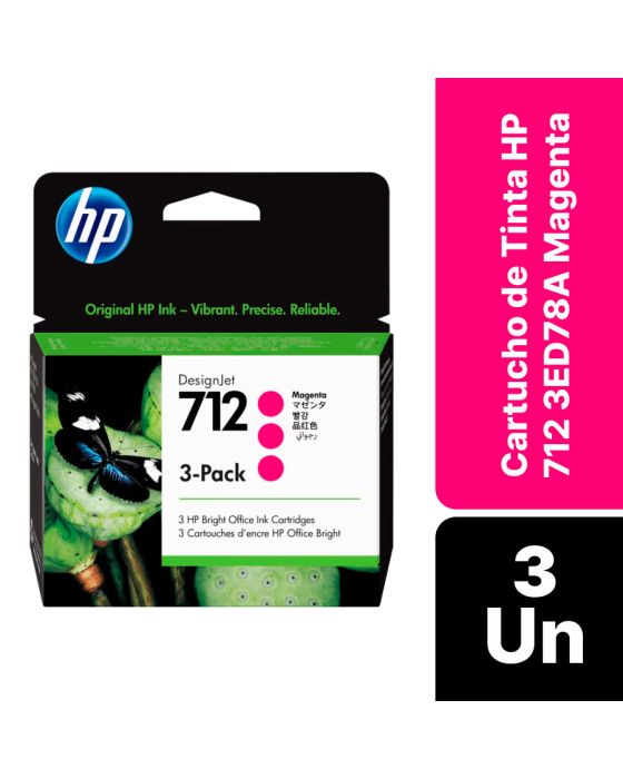 Características:Imprima documentos com cores nítidas e intensas. As tintas HP originais oferecem uma resistência extraordinária à descoloração e confiabilidade e desempenho superiores.A qualidade da HP que você conhece e confia agora mais acessível do que nunca. Imprima documentos e fotos resistentes à água e manchas e economize em impressão freqüente com os cartuchos originais HP.Detalhes:- Marca: HP;- Modelo: 712;- Referência: 3ED78A;- Linha: Cartuchos;- Cor: Magenta;- Volume cartucho: 29ml cada;- Contém: 1 embalagem com 3 unidades do produto;- Tecnologia de impressão: Jato de Tinta;- Produto Original.Fabricado na Malásia.Impressoras Compátiveis:- Modelos Impressora HP DesignJet T210, Impressora HP DesignJet T230, Impressora HP DesignJet T250, Impressora HP DesignJet T630, Impressora HP DesignJet T650 e Impressora HP DesignJet Studio.Medidas:- Dimensões embalagem: 12 x 4,7 x 12,4cm (CxLxA).Descarte de Cartuchos e Toners:- Você pode fazer o descarte com ajuda do ReCiclo, um projeto da Contabilista através da Contabilista Responsável, basta enviar os seus resíduos para a nossa Central de Distribuição*, se você é de Curitiba ou de Joinville, pode ir até uma de nossas lojas ou preencher o formulário disponível no site para solicitar retirada de materiais.Acesse o Link para verificar as marcas que reciclamos e nossos endereços: https://www.contabilistaresponsavel.com.br/reciclo.* Enviar conteúdo aos cuidados do Setor de Reciclagem.** Atenção: Cartuchos e Toners compatíveis não entram no descarte do ReCiclo, apenas suprimentos originais de nossos parceiros (confira a lista no link acima).Conteúdo da embalagem: 3 Cartuchos de Tinta 712 3ED784.* As especificações podem ser alteradas sem aviso prévio ** Imagem meramente ilustrativa.