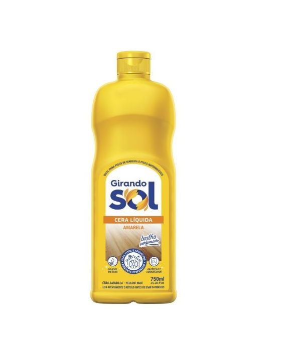 Caracteristicas:Cera Líquida GIRANDO SOL é ideal para madeira e pisos frios como:cerâmica, lajotas, linóleo, paviflex, vulcapiso, ladrilhos, pastilhas, borracha, granito, mármore, pedra ardósia ou qualquer outro piso impermeável. Na conservação de pisos vitrificados comverniz, poliuretano ou similares.- 3 opções (incolor, amarela e vermelha)- Ideal para madeira e pisos frios- Conserva pisos vitrificados com verniz, poliuretano e similares.Modo de Usar:Uso Puro : Lave o piso com uma mistura de água com um limpador amoniacal ou detergente. Sobre o piso limpo e seco, aplique uniformemente a Cera Líquida GIRANDO SOL com um pano e deixe secar. Se desejar um brilho mais intenso, lustre com enceradeira ou com uma flanela limpa.Uso Diluído (Limpeza do piso ou assoalho)Dilua em um balde 2 colheres de sopa (30ml) de Cera Líquida GIRANDO SOL, para cada litro de água. Se desejar mais brilho, aumente a quantidade do produto. Molhe um pano limpo na solução,aplique sobre o piso e deixe secar. Obs.: Lave a colher medida antes de reutilizá-la para outros fins.Cuidados - Cuidado: irritante para os olhos e mucosas- Evitar contato prolongado com a pele, lavar as mãos após o uso- Manter fora do alcance de crianças e animais domésticos- Mantenha o produto em sua embalagem original- Em caso de contato com os olhos, lave-os com água- Se inalado em excesso, leve a pessoa a um local bem ventilado- Em caso de ingestão, não provoque vômito e consulte imediatamente o Centro de Intoxicações ou o seu médico, levando o rótulo do produto.Composição Química:- Composição: Parafina, Cera de Carnaúba, Monoestearato de Sorbitano, Ácido Esteárico, Monoetanolamina, Monoestearato de Glicerina, Álcool Ceto Estearílico, Resina, Amoníaco, Preservante, Corante, Fragrância e Água.* As especificações podem ser alteradas sem aviso prévio ** Imagem meramente ilustrativa