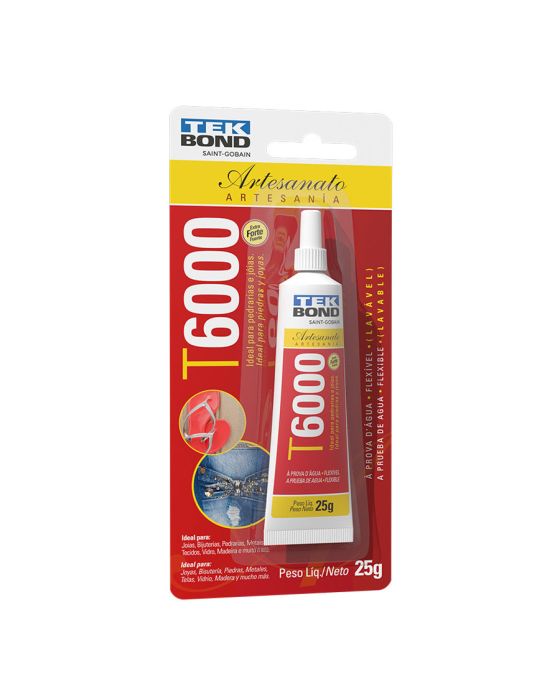 Caracteristicas:A Cola Permanente T6000 é indicada para trabalhos artísticos, especialmente a criação de bijuterias e colagem de pedrarias em geral!Detalhes:- Marca Tekbond.- Modelo: T6000.- Linha: Cola Permanente.- Peso Liquído: 25g.- Aparência (visual): Líquido claro.- Depois de seco mantém-se transparente e flexível.- Possui excelente flexibilidade.- Adere uma variedade materiais.- Permite tempo de posicionamento.- Resiste a produtos ácidos e alcalinos diluídos.- Pode ser lavado e pintado.Composição:- Elastômeros sintéticos, benzeno e acetato de etila.Modo de Uso:1. Todas as superfícies a serem coladas deverão estar limpas e isentas de poeira, óleo, tinta solta, cera ou graxas.2. Aplique o adesivo diretamente sobre as superfícies a serem coladas.3. Para melhores resultados, a temperatura do adesivo e das superfícies a serem coladas devem estar entre 18 e 32°C. 4. Espere entre 1 e 2 minutos, em seguida una as superfícies fazendo pressão.5. A cura total ocorre em 24 horas. Dependendo dos materiais, a força máxima pode ser atingida entre 48 e 72 horas após a aplicação. 6. Para evitar entupimentos, após a utilização, remova o excesso de adesivo do bico com acetona. O adesivo curado pode ser removido por corte ou raspagem.Precauções:- EM CASO DE CONTATO COM A PELE: Lave imediatamente o local atingido com sabão e água em abundância. Procure um médico levando consigo a embalagem do produto.- EM CASO DE CONTATO COM OS OLHOS: Enxágue cuidadosamente com água durante vários minutos. No caso de uso de lentes de contato, remova-as, se for fácil. Continue enxaguando. Lave com água corrente e limpa por pelo menos 15 minutos. Se a irritação persistir, consulte um médico levando consigo a embalagem do produto.- EM CASO DE INGESTÃO: Enxágue a boca. Não provoque o vômito. Nunca dê nada via oral a uma pessoa inconsciente. Envie o acidentado até o Serviço de Saúde ou Centro de Informações Toxicológicas mais próximo, levando consigo a embalagem do produto. * As especificações podem ser alteradas sem aviso prévio ** Imagem meramente ilustrativa