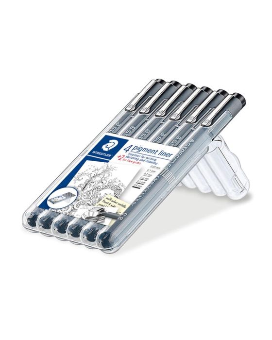 CaracteristicasCaixa STAEDTLER contendo 6 pigment liner, traços pretos sortidos (0.05/0.1/0.2/0.3/0.5/0.8)Informações do produto- Fineliner para escrita, esboços e desenhos- Tinta pigmentada, permanente (em conformidade com ISO 14145-2), resistente à luz, à prova d'água no papel- CAP OFF: pode ficar sem tampa por pelo menos 12 horas sem secar (apenas tinta preta)- Apagável quando usada em papel de desenho, não escorrendo quando destacada- Ponta longa de metal, ideal para uso com réguas e transferidores, exemplo: Mars 572 FL- Corpo em polipropileno (PP) garante uma longa duração- Airplane-safe: sistema automático de equalização de pressão, previne o vazamento enquanto a bordo de aviões- Disponível em caixa STAEDTLER stand-up* As especificações podem ser alteradas sem aviso prévio ** Imagem meramente ilustrativa