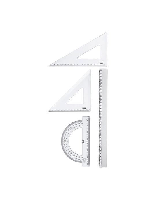Caracteristicas:Conteúdo - 01 régua 30cm, - 01 esquadro 21x45, - 01 esquadro 21x60, - 01 transferidor 180ºMedidas - Altura: 2mm - Largura: 132mm - Comprimento: 360mm Conteúdo - 01 régua 30cm, - 01 esquadro 21x45, - 01 esquadro 21x60, - 01 transferidor 180º - Fabricante: Waleu - Peso: 100 Gr - Garantia de 7 dias pela loja e 90 pelo fabricante - Confeccionado em Plástico Poliestireno - Cor: Cristal * As especificações podem ser alteradas sem aviso prévio ** Imagem meramente ilustrativa