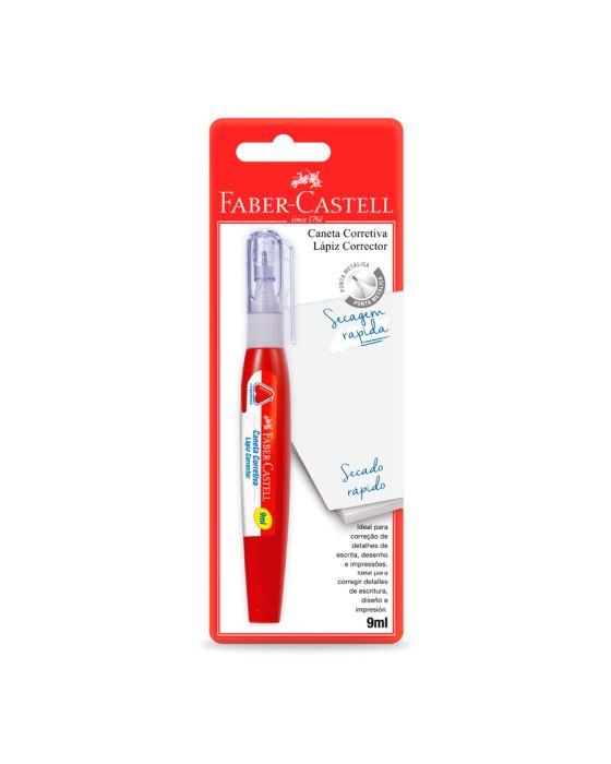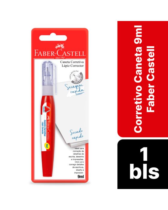 Características:Quando se trata de praticidade e eficiência, as canetas corretivas da Faber-Castell são a escolha definitiva. Com sua ponta metálica e secagem rápida, essas canetas são perfeitas para correções precisas e rápidas, tornando-se indispensáveis para estudantes e profissionais.Seja para correções em sala de aula, no escritório ou durante um projeto de arte, as canetas corretivas Faber-Castell são a escolha perfeita para quem busca praticidade, eficiência e qualidade. Com sua ponta metálica, secagem rápida e design ergonômico, essas canetas tornam o processo de correção mais fácil e rápido do que nunca.Detalhes:- Marca: Faber-Castell;- Referência: SM/CC9ML;- Linha: Corretivos;- Tipo: Caneta;- Cor: Branco;- Volume: 9ml;- Contém: 1 blister com uma unidade do produto;- Nova embalagem: Aumento de 7ml para 9ml;- Secagem rápida.Ideal para: - Correção de detalhes de escrita, desenho e impressões.Modo de uso:- Com a caneta tampada, agite bem;- Posicione e pressione a ponta da caneta contra o papel;- Mantenha fechada após o uso.Composição:- Corpo e tampa: Fabricado em resinas termoplásticas;- Tinta: Fabricado em resinas, pigmentos, solventes e adtivos;- Ponta: fabricado em metal.Precauções:- Mantenha fora do alcance das crianças e longe do fogo ou fontes de calor excessivo;- Evitar temperaturas de 45°C e exposição direta aos raios solares;- Armazenar em lugar seco e ventilado.Medidas:- Dimensões do produto: 13 x 1,8 x 1,8cm (CxLxA);- Dimensões da embalagem: 19,6 x 7,2 x 1,8cm (CxLxA);- Peso: 0,027g.ATENÇÃO! NÃO RECOMENDÁVEL PARA CRIANÇAS MENORES DE 3 (TRÊS) ANOS POR CONTER PARTE(S) PEQUENA(S) QUE PODE(M) SER ENGOLIDA(S) OU ASPIRADA(S).As especificações podem ser alteradas sem aviso prévio ** Imagem meramente ilustrativa.