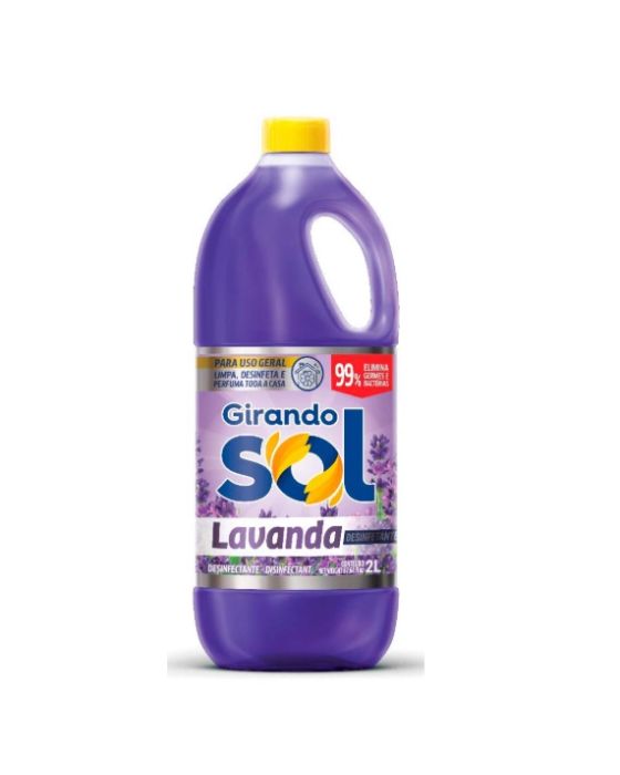 Características:- Desinfetante Girando Sol- Desinfetante com ação bactericida- Ótimo para limpeza de azulejos, esmaltados, pisos e mármores- Embalagem: 2000mlModo de Usar: Puro = Como desinfetante e bactericida: vasos sanitários, ralos, latas de lixo, aplique diretamente nas bordas. Deixe agir por 10 minutos para obter ação eficiente.Diluído Na limpeza, aplicar em pisos, azulejos, esmaltados, banheiras e mármore. Use 2 tampas por litro de água.Cuidados - Manter fora do alcance de crianças e animais domésticos.- Mantenha o produto em sua embalagem original.- Não reutilize a embalagem vazia para outros fins.- Não utilizar em carpetes e tecidos.- Em caso de contato com os olhos, lave-os com água corrente em abundância, por pelo menos 15 minutos.- Em contato com a pele, lave as partes atingidas com água em abundância.- Em ambos os casos, se houver sinais de irritação, procure socorro médico, levando a embalagem ou o rótulo do produto.- Em caso de aspiração ou inalação excessiva, remova a pessoa para local arejado e se houver sinais de intoxicação, chame socorro médico.- Em caso de ingestão, não provoque vômito e consulte imediatamente o Centro de Intoxicações ou o seu médico, levando o rótulo do produto.* As especificações podem ser alteradas sem aviso prévio ** Imagem meramente ilustrativa