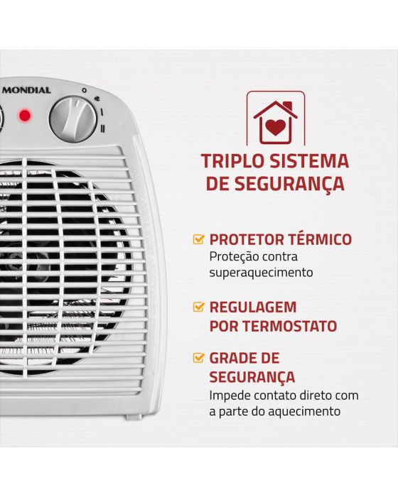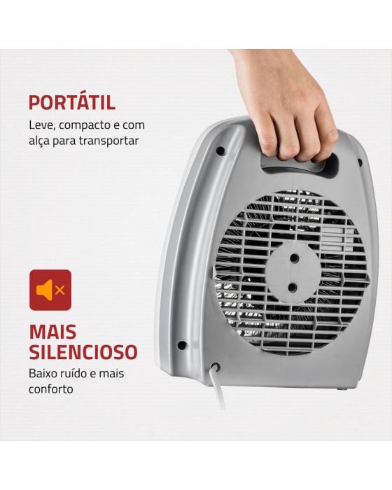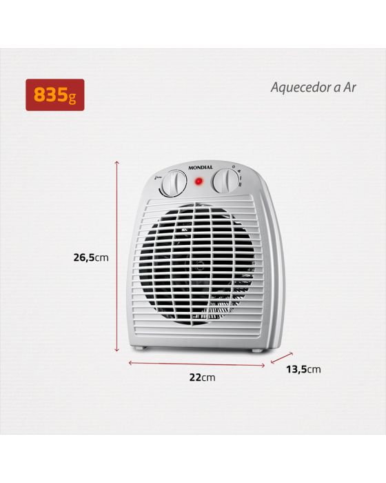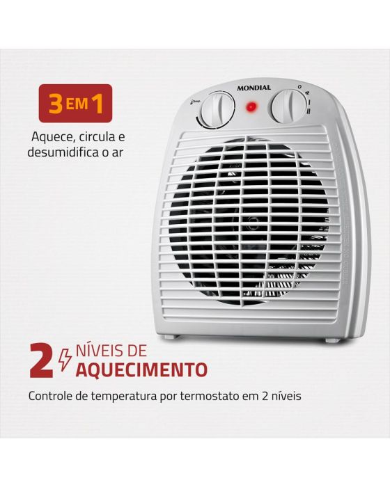 Características:O aquecedor A-08 é 3 em 1: ele aquece, circula e desumidifica o ar. O aparelho tem 2 níveis de aquecimento, é leve e portátil, e você pode transportá-lo entre os cômodos com facilidade. Além de ser mais silencioso e proporcionar um ambiente tranquilo e confortável!Detalhes:- Marca: Mondial.- Modelo: A-08.- Linha: Aquecedor de ambientes.- Cor: Cinza.- Tensão: 220V.- Contém: 1 unidade do produto.- Timer: Não- Tipo de Aquecimento: Termoventilador.- Possui Termostato.- 3 em 1: Aquece, circula e desumidifica o ar.- 2 Níveos de aquecimento.- Triplo sistema de segurança.- Portátil.- Silencioso.Ideal para: - Para ambientes até 25m2, como banheiros, salas e quartos.Aquecimento:- 2 Níveis de aquecimento: O aquecedor tem controle gradual de temperatura por termostato com 2 níveis de aquecimento, além da opção de circulação de ar.Função:- Função Ventilação: O aquecedor também tem a opção de ventilação, tornando o produto muito prático! Pode ser usado apenas na função ventilar, sem ligar a resistência.Triplo sistema de segurança: - Protetor térmico: Proteção contra superaquecimento.- Regulagem por termoestato.- Grade de segurança: Impede contato direto com a área do aquecimento.Energia:- Tensão: 220V.- Consumo de energia: 1,5Kw/h.- Tomada: 20A.- Potência Máxima: 1500W.Medidas:- Dimensões: 22 x 13,5 x 26,5cm (CxLxA).- Peso: 835g.Composição: ABSe componentes eletrônicos.Conteúdo da embalagem: 01 Aquecedor e 1Manual de Instruções.Garantia do fornecedor: 12 meses contra defeitos de fabricação.* As especificações podem ser alteradas sem aviso prévio ** Imagem meramente ilustrativa.