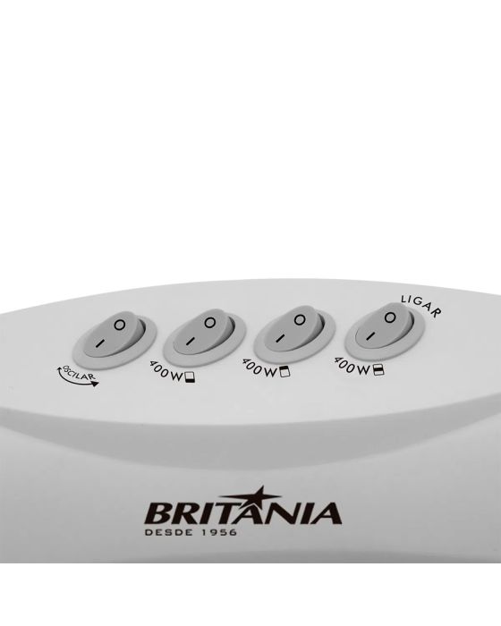 Características:Seu lar mais quentinho com o Aquecedor Britânia AB1200W! Possui 3 níveis de potência, 400W, 800W e 1200W para você regular de acordo com sua necessidade! Com o sistema de oscilação é possível distribuir uniformemente o calor no ambiente. Para sua segurança possui grade protetora que evita o contato direto com o sistema de aquecimento. E com o sistema de segurança você pode confiar que, em caso de queda, o aparelho desligará automaticamente. No inverno, nada melhor que ficar em casa em um ambiente feito para te proteger e te aquecer. Conte com o Aquecedor Britânia AB 1200W!Detalhes:- Marca: Britânia;- Modelo: AB1200W;- Linha: Aquecedores;- Cor: Branco;- Tensão: 127V;- Aquecimento: Lâmpadas de Halogênio;- Contém: 1 unidade do produto;- 3 níveis de potência: 400W, 800W e 1200W;- Função oscilar, distribui melhor o calor;- Proteção contra tombamento;- Alça para transporte;- Cordão elétrico com 1,30m de comprimento;- Dispositivos de segurança para evitar sobreaquecimento.Benefícios:- 3 níveis potências: 400W, 800W e 1200W;- Sistema de Segurança: Desliga automaticamente em caso de queda;- Sistema de Oscilação: Permite a distribuição do calor no ambiente;- Grade protetora: Maior segurança. Evita o contato direto com o sistema de aquecimento.Energia:- Tensão: 127V;- Potência: 1200W;- Consumo (kW/h): 1,2 kW/h;- Tomada (A): 10A (127V);- Pinos plug: 3 pinos.Composição: - Fabricado em Metal, Plástico e Vidro.Medidas:- Dimensões do produto: 37,6 x 30 x 54,8cm (CxLxA);- Dimensões da embalagem: 34,5 x 16 x 57,5cm (CxLxA);- Peso do produto: 2,208kg;- Peso da embalagem: 2,650kg.Conteúdo da embalagem: 1 Aquecedor AB1200W Britânia e 1 Manual de Instruções.Garantia do fornecedor: 1 ano contra defeitos de fabricação.* As especificações podem ser alteradas sem aviso prévio ** Imagem meramente ilustrativa.