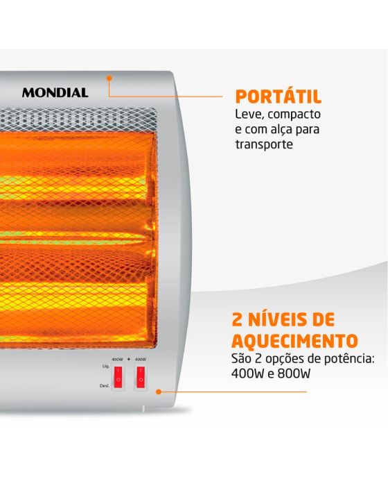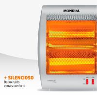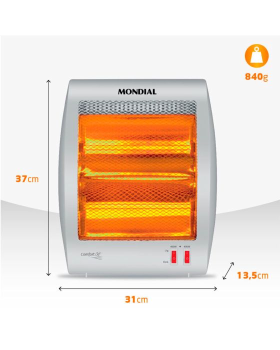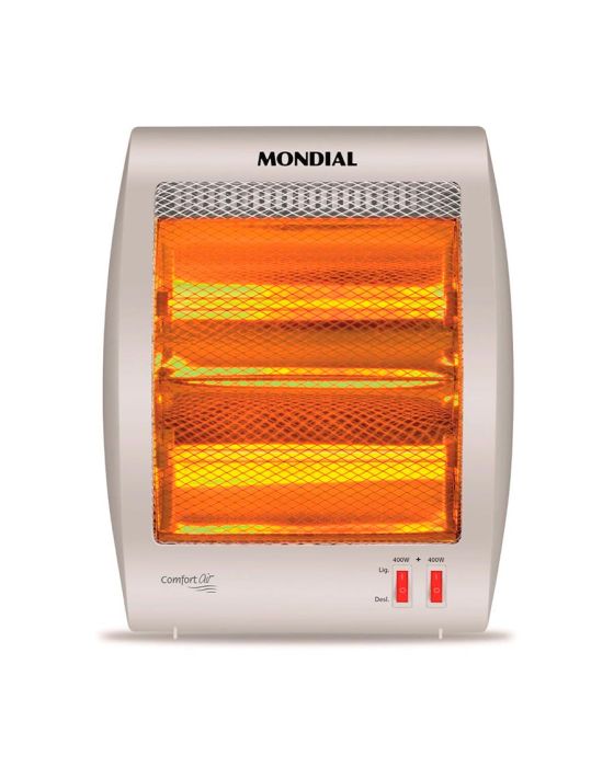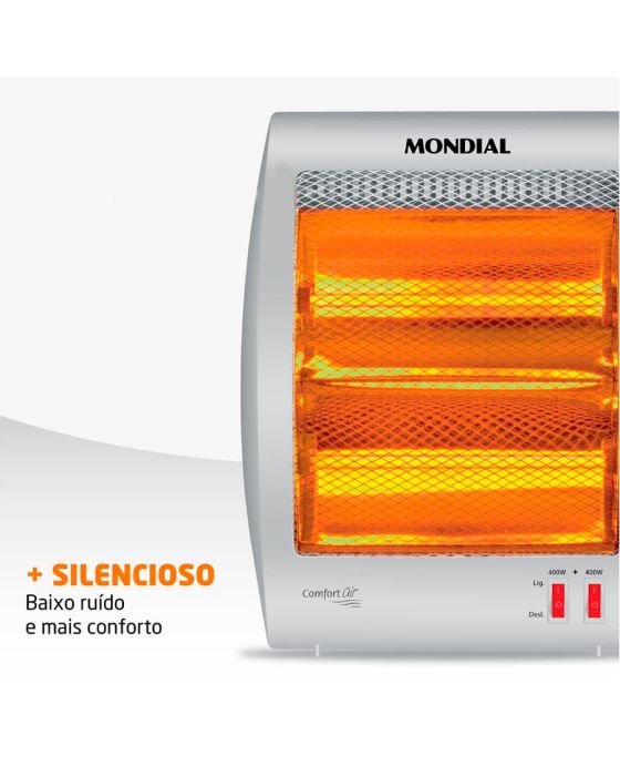 Características:O aquecedor de ar A-09 é 2 em 1: aquece e desumidifica o ar. O aparelho possui dois níveis de temperatura, com potências de 400W e 800W, e você pode regular de acordo com a sua preferência. Além disso, é portátil e mais silencioso, proporcionando um ambiente tranquilo e confortável.Detalhes:- Marca: Mondial;- Modelo: A-09;- Linha: Aquecedor de ambientes;- Cor: Cinza;- Voltagem: 110V(127V);- Potência: 800W;- Aquecimento: Lâmpadas de Halogênio;- Contém: 1 unidade do produto;- Baixo nível de ruído: ambientes mais tranquilos;- Alça para transporte;- Portátil e Prático;- Uso residencial.Benefícios:- 2 em 1: Além de promover o aquecimento, o A-09 ainda desumidifica o ar do ambiente, garantindo um cômodo quentinho e confortável;- 2 Níveis de Aquecimento: São 2 opções de potência: 400W e 800W. Escolha de acordo com sua preferência!- Mais Silencioso: Aquecimento com baixo ruído, proporcionando noites tranquilas e agradáveis;- Portátil: Leve, compacto e com alça para transporte. Facilidade de levar seu aquecedor para qualquer cômodo!- Mais Segurança: Equipado com sistema de desligamento automático em caso de queda. Garantia de mais segurança e proteção para a sua família!Aquecimento:- Tipo de aquecimento: Aquecedor Cerâmico.- Níveis de aquecimento: 2 Níveis de Aquecimento, 400W e 800W.Energia:- Tensão: 127V- Potência: 800W;- Consumo de energia: 0,8 Kw/h;- Tomada: 20A.Medidas:- Dimensões: 36,5 x 29,5 x 13,5cm (AxLxP).- Comprimento do cabo: 1m.- Peso: 840g.Garantia do fornecedor: 01 ano contra defeitos de fabricação.Conteúdo da embalagem: 1 Aquecedor A-09 Mondial, manual de instruções.* As especificações podem ser alteradas sem aviso prévio ** Imagem meramente ilustrativa.