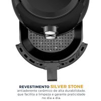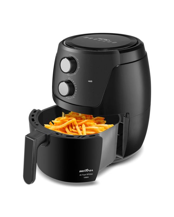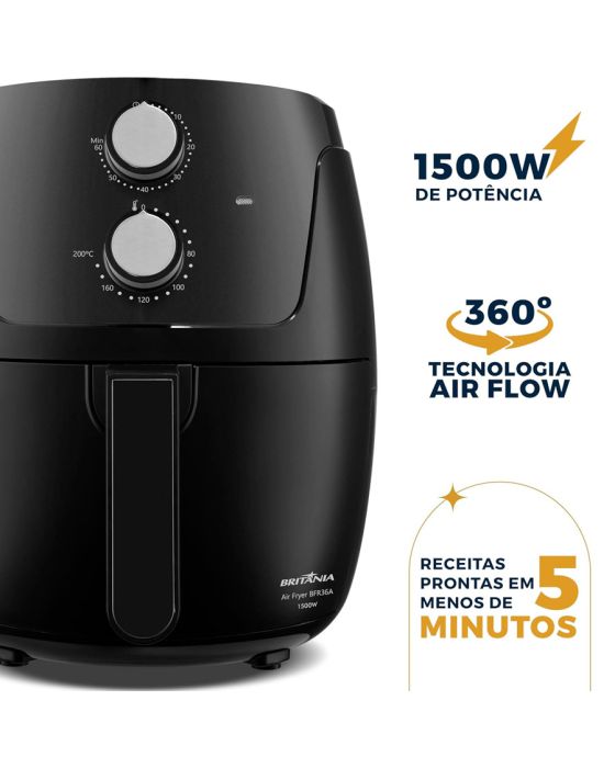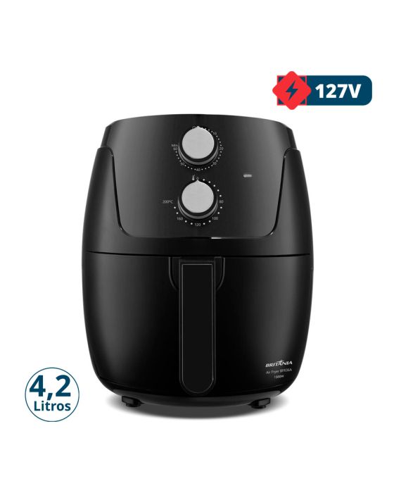Características:- Tecnologia, desempenho e alimentação saudável em um só produto: A Fritadeira Elétrica Air Fryer Britânia BFR36A 4,2L 127V foi desenvolvida para quem busca praticidade, eficiência e alimentação mais saudável, permitindo preparar diversos tipos de alimentos sem adição de óleo e com resultado crocante por fora e macio por dentro.- Desempenho e eficiência no preparo: Com potência de 1.500W e capacidade de 4,2 litros, a Air Fryer Britânia garante preparo rápido e uniforme graças à tecnologia Air Flow 360°, que faz o ar quente circular continuamente dentro da cuba, otimizando o cozimento e reduzindo o tempo de preparo.- Controle preciso de tempo e temperatura: Possui timer de 60 minutos com desligamento automático e seletor de temperatura ajustável entre 80°C e 200°C, possibilitando preparar desde petiscos, carnes, peixes, legumes e batatas fritas até bolos e sobremesas, tudo com facilidade e precisão.- Durabilidade e facilidade na limpeza: A cuba conta com revestimento interno Silver Stone, um antiaderente cerâmico de alta resistência que evita que os alimentos grudem e facilita a limpeza após o uso, garantindo mais praticidade no dia a dia.Segurança e praticidade no uso: O modelo dispõe de proteção contra superaquecimento e luz indicadora de funcionamento, assegurando uso seguro e intuitivo em qualquer ambiente.- Design funcional e moderno: Com acabamento na cor preta e estrutura compacta, a fritadeira combina design elegante e funcionalidade, adaptando-se facilmente a diferentes estilos de cozinha.- Aplicações e versatilidade: Ideal para uso doméstico, a Air Fryer Britânia é perfeita para preparo rápido de refeições, lanches e petiscos, sendo uma aliada prática em rotinas que exigem rapidez, economia e alimentação mais leve.- Marca de confiança: A Britânia é uma das marcas mais tradicionais do Brasil no setor de eletrodomésticos, reconhecida por unir inovação, qualidade e praticidade em seus produtos.- Garantia do fornecedor: Garantia limitada de 1 ano contra defeitos de fabricação.- Dimensões do produto: Comprimento: 25,6cm; Largura: 32,1cm; Altura: 34,5cm; Peso: 9,13kg.- Dimensões da embalagem: Comprimento: 25,6cm; Largura: 32,1cm; Altura: 34,5cm; Peso: 9,13kg.* As especificações podem ser alteradas sem aviso prévio ** Imagem meramente ilustrativa.