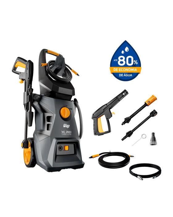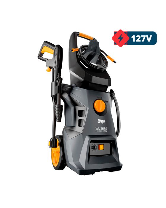 Características:- Lavadora de alta pressão turbo para limpezas pesadas e contínuas: A Lavadora de Alta Pressão WAP WL 2660 Turbo foi desenvolvida para entregar alto desempenho em limpezas intensas, unindo potência, eficiência e economia. Com 1800W de potência e funcionamento em 127V, é indicada para usuários que necessitam de um equipamento robusto, capaz de lidar com sujeiras difíceis em diferentes ambientes residenciais e externos.- Alto poder de remoção com pressão máxima de 2.000 PSI: Equipada com pressão máxima de 2.000 PSI e vazão de 420 L/h, a WL 2660 Turbo proporciona jatos de água fortes e constantes, ideais para remover sujeiras impregnadas com rapidez. O bico turbo gera jato rotativo concentrado, aumentando a área de impacto e a eficiência da limpeza, especialmente em superfícies mais resistentes.- Versatilidade para múltiplas aplicações: Projetada para atender diversas demandas, a lavadora é indicada para limpeza de pisos, paredes, carros, motos, bicicletas, jardins e áreas externas. O bico regulável permite ajustar o tipo de jato conforme a superfície, enquanto o aplicador de detergente auxilia na remoção de sujeiras mais pesadas, otimizando o tempo de trabalho.- Mobilidade, praticidade e economia de água: A mangueira de nylon de 5 metros e o cabo elétrico de 5 metros garantem maior liberdade de movimento durante o uso, reduzindo a necessidade de trocar de tomada. O sistema eletrônico Stop Total desliga automaticamente o motor ao soltar o gatilho, proporcionando mais segurança, menor desgaste do equipamento e economia de energia. Além disso, a WL 2660 Turbo oferece economia de até 80% de água quando comparada ao uso de mangueiras convencionais.- Construção segura e especificações técnicas: O equipamento conta com motor universal, bomba axial, classe de proteção IPX5 e classe de isolação II, assegurando resistência e confiabilidade no uso contínuo. Opera em 127V, frequência de 60 Hz, com nível de ruído de 90 dB(A), mantendo desempenho compatível com a categoria profissional leve.- Sobre a marca WAP: A WAP é referência no desenvolvimento de soluções para limpeza, reconhecida pela robustez, inovação e desempenho de seus produtos.- Itens inclusos na embalagem: 1 Bico Ajustável; 1 Mangueira de alta pressão 5 metros; 1 Cordão de Alimentação 5 metros; 1 Engate Rápido; 1 Aplicador de Detergente; 1 Agulha desobstruidora; 1 Bico turbo e 1 manual de instruções.- Garantia do fornecedor: 1 ano contra defeitos de fabricação.- Dimensões do produto: Comprimento: 32,9cm; Largura: 26,2cm; Altura: 70cm; Peso: 8,2kg.- Dimensões da embalagem: Comprimento: 42cm; Largura: 32,5cm; Altura: 49,5cm; Peso: 9,5kg.* As especificações podem ser alteradas sem aviso prévio ** Imagem meramente ilustrativa.